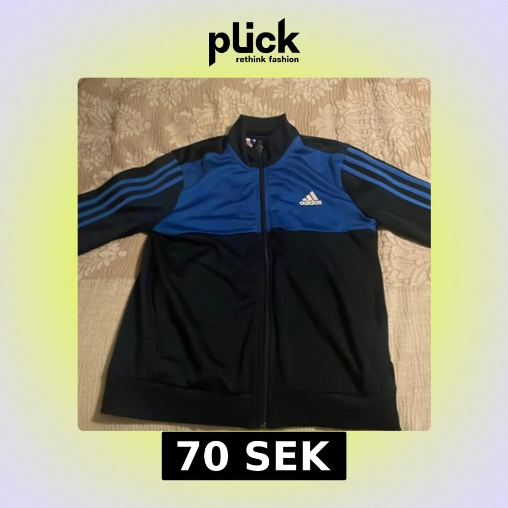 Säljer en klassisk Adidas träningsjacka i blått och svart med vita loggan på bröstet. Jackan har dragkedja, ribbade muddar och de ikoniska tre ränderna längs ärmarna. Perfekt för sport eller chill dagar.
