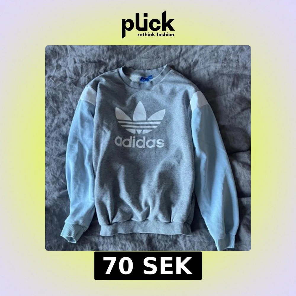 Säljer en snygg grå sweatshirt från Adidas med stora vita loggan framtill. Tröjan har ljusblå ärmar med vita detaljer vid axlarna och ribbade muddar. Perfekt för en chill och sportig stil. Materialet är mjuk bomullsmix och passformen är normal.