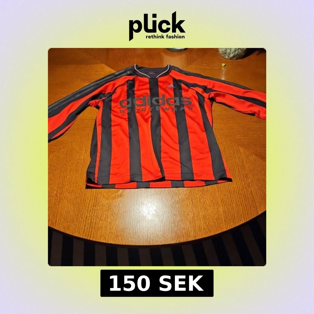 Snygg långärmad fotbollströja från Adidas med klassiska svarta och röda vertikala ränder. Stor Adidas Sportswear-logga på bröstet och tre svarta ränder längs ärmarna. Tillverkad i lätt och ventilerande polyester, perfekt för träning eller match. Tvättlapp bortklippt