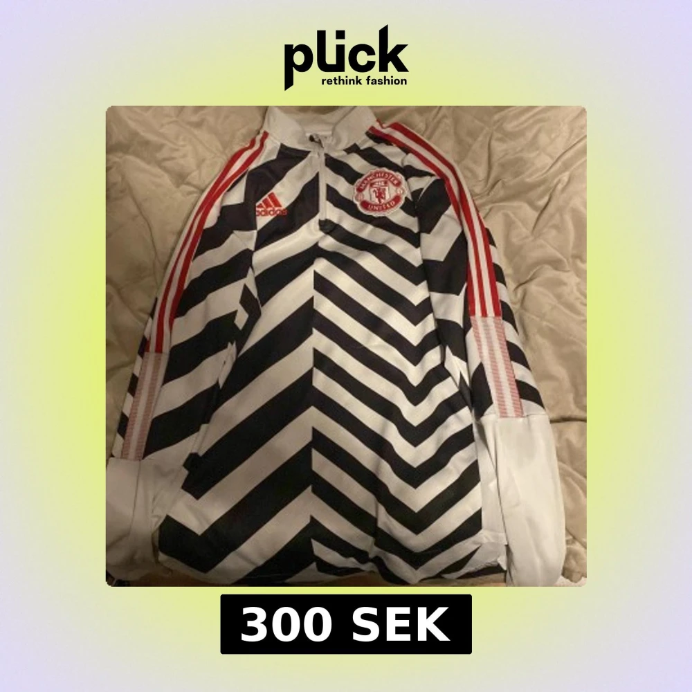 Säljer en unik svartvit randig fotbollströja från Adidas med Manchester United-logga på bröstet. Tröjan har röda detaljer och en halv dragkedja framtill. Perfekt för fans av laget!