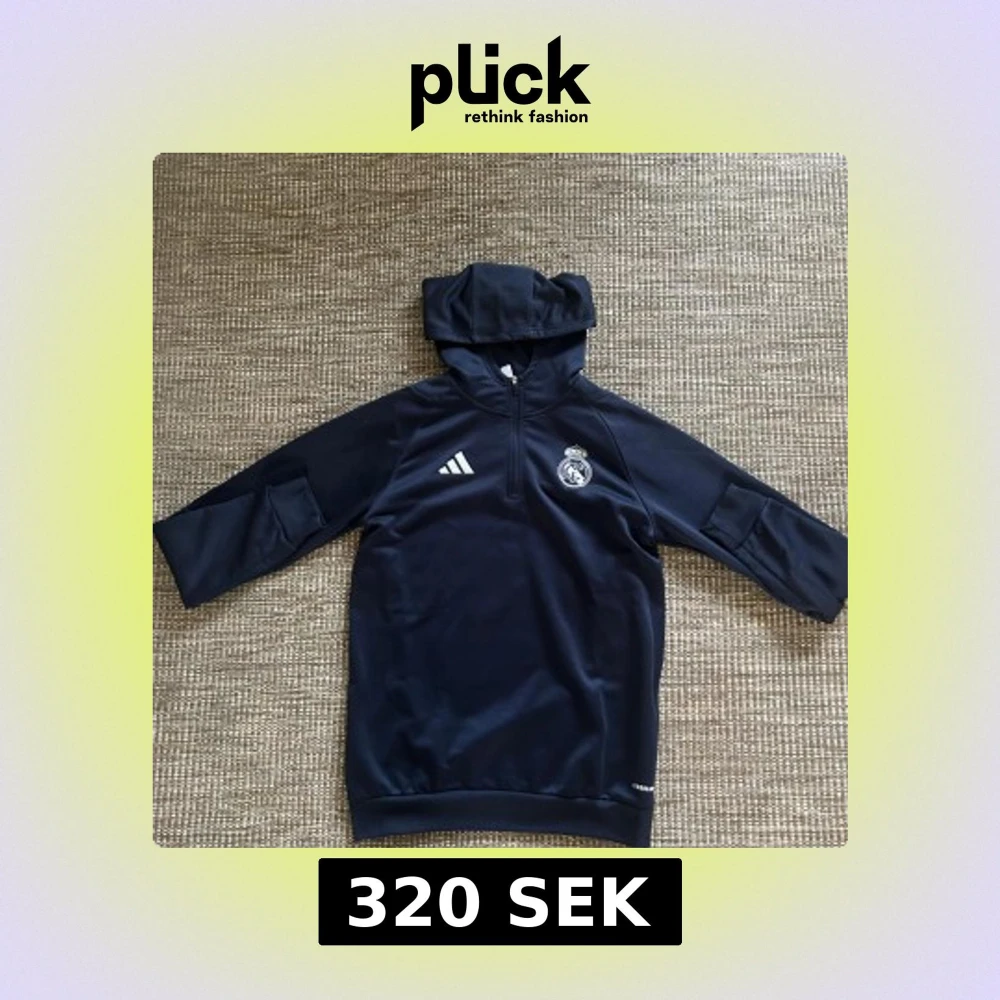 Snygg mörkblå hoodie från Adidas med Real Madrid-logga på bröstet och klassiska ränder i vitt, grått och gult på ärmarna. Tröjan har huva, lång ärm och half zip framtill. Perfekt för fotbollsträning eller chill dagar.