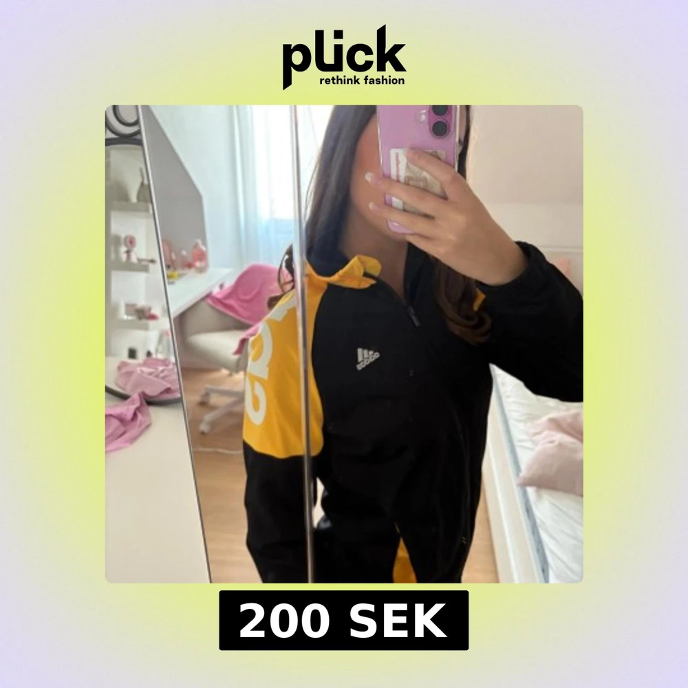 Säljer en svart och gul vindjacka från Adidas med dragkedja framtill och höga krage. Jackan har vita Adidas-loggor på bröstet och axlarna, samt långa ärmar. Perfekt för dig som gillar sportig och färgstark stil. Har tyvär ingen nytta för den mer😛❤️