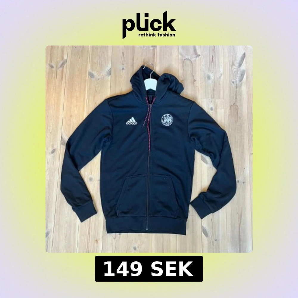 Svart hoodie från Adidas med Ajax-logga på bröstet och vit Adidas-logga. Tröjan har huva med snörning, hel dragkedja och två fickor framtill. Perfekt för dig som gillar sportig stil och vill representera Ajax.
