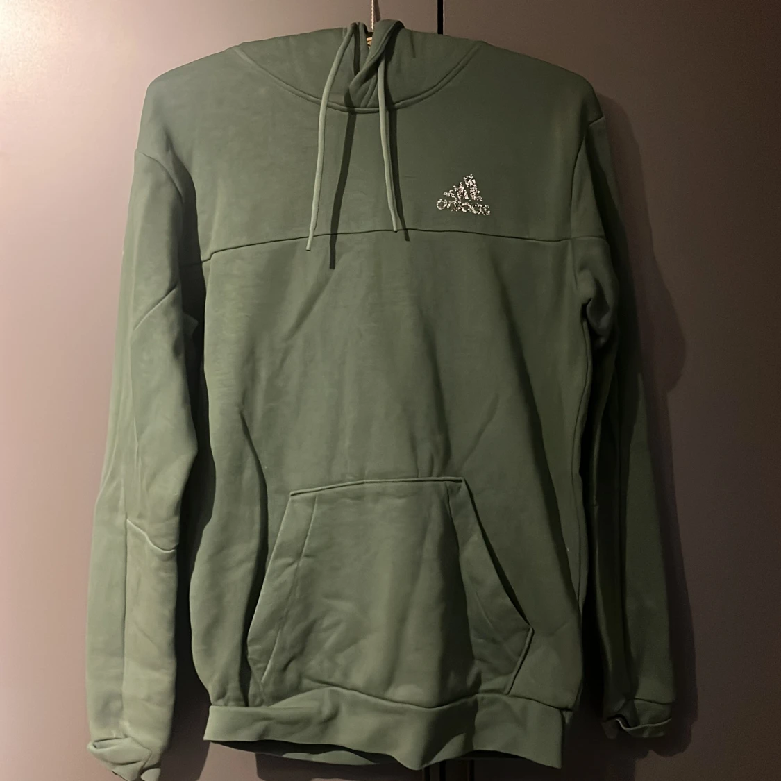 Säljer en grön hoodie från Adidas med klassisk logga på bröstet. Tröjan har huva med snörning och en stor magficka framtill. Perfekt för chill dagar eller när du vill ha en avslappnad stil.