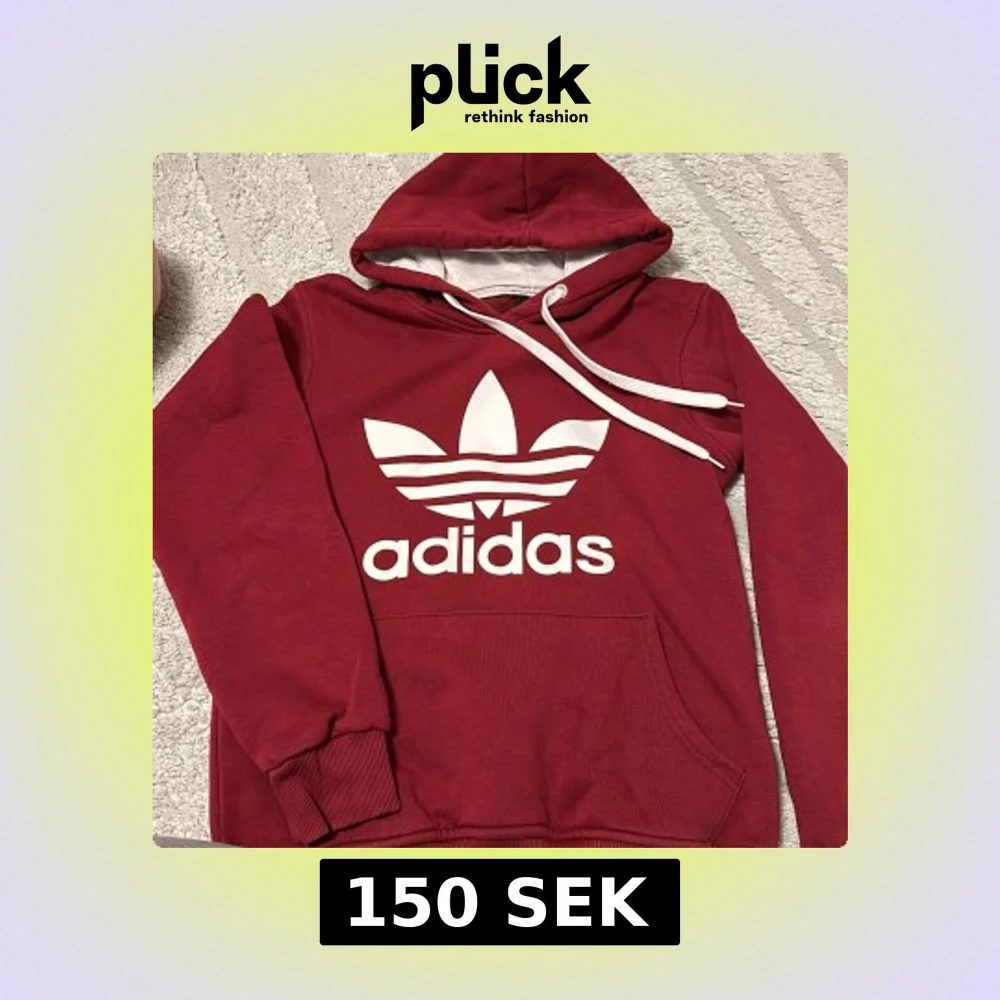 Säljer en snygg röd hoodie från Adidas med stor vit Trefoil-logga och text på bröstet. Tröjan har huva med vita snören och en stor magficka. Perfekt för dig som gillar sportig och avslappnad stil.