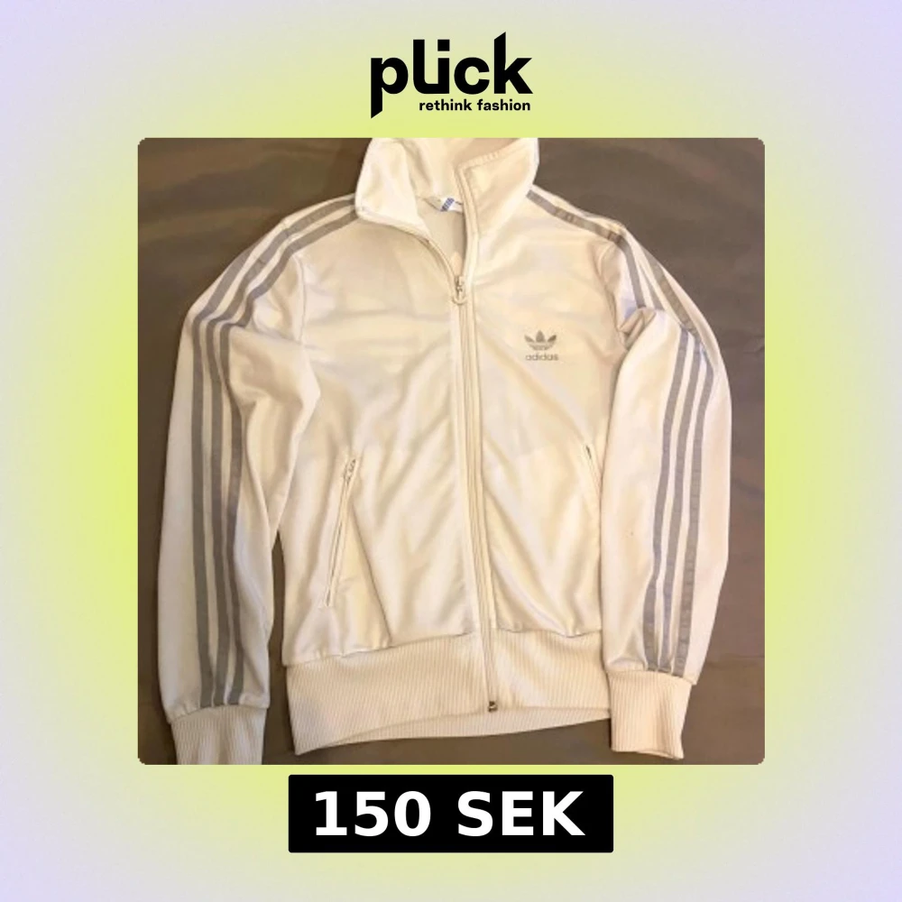 Snygg vit Adidas track jacket med klassiska silverfärgade ränder längs ärmarna och stor Trefoil-logga på ryggen. Hög krage, hel dragkedja och två fickor framtill. Perfekt för en sportig och clean look. Tröjan är liten i storleken trots att det står 42 på tröjan jag tycker att det är stolek S,på armen finns litet håll som syns på bilden.