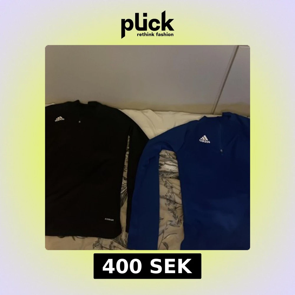 Två långärmade träningströjor från Adidas, en svart och en blå. Båda har halv dragkedja framtill och Adidas-logga på bröstet. Perfekta för träning eller sport. Tillverkade i funktionsmaterial som andas och transporterar bort fukt.