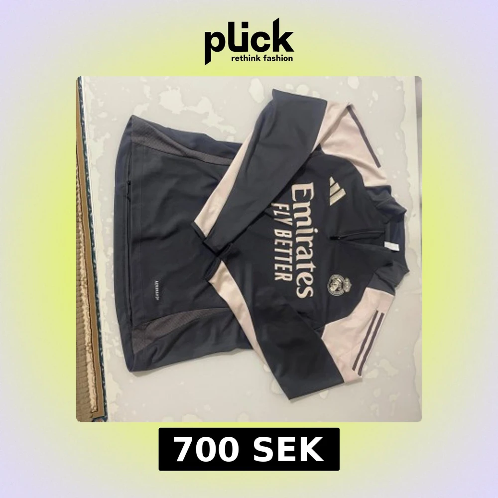 Snygg mörkblå och beige träningshoodie från Adidas med Real Madrid-logga och Emirates Fly Better-tryck på bröstet. Half zip framtill och långa ärmar med klassiska Adidas-ränder på axlarna. Perfekt för fotbollsträning eller chill. Materialet är polyester.