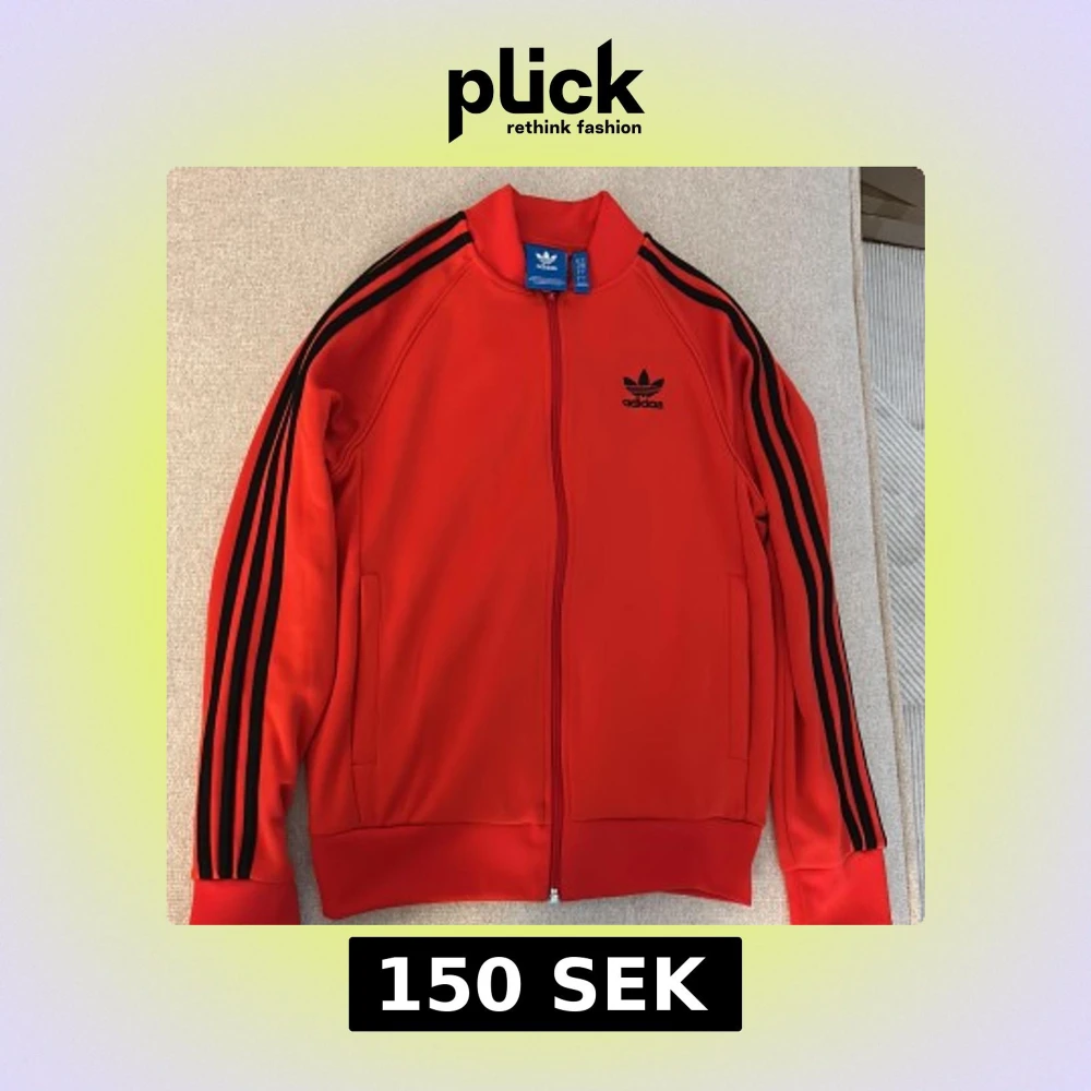 Riktigt snygg röd Adidas track jacket med klassiska svarta tre ränder längs ärmarna och broderad logga på bröstet. Jackan har dragkedja hela vägen, ståkrage och två fickor. Perfekt för en sportig och retro vibe.