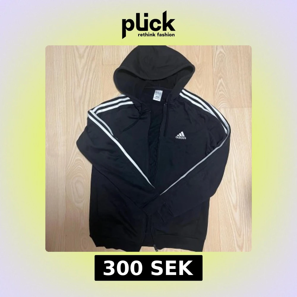 Svart hoodie från Adidas med klassiska vita ränder längs ärmarna och Adidas-logga på bröstet. Tröjan har huva med snörning och dragkedja framtill. Perfekt för chill eller träning, och tillverkad i mjuk polyester.