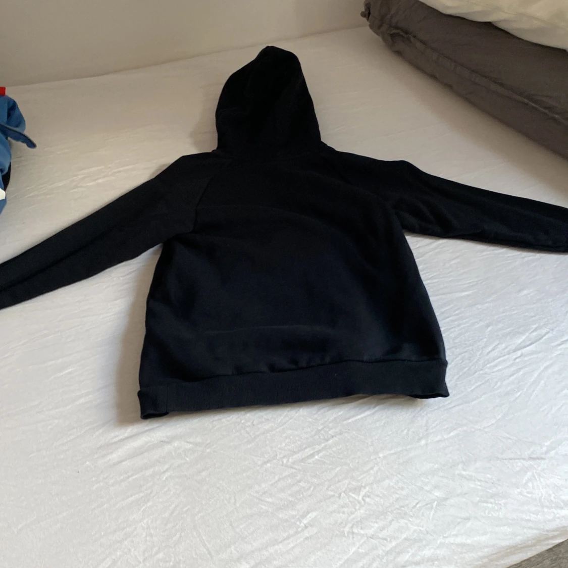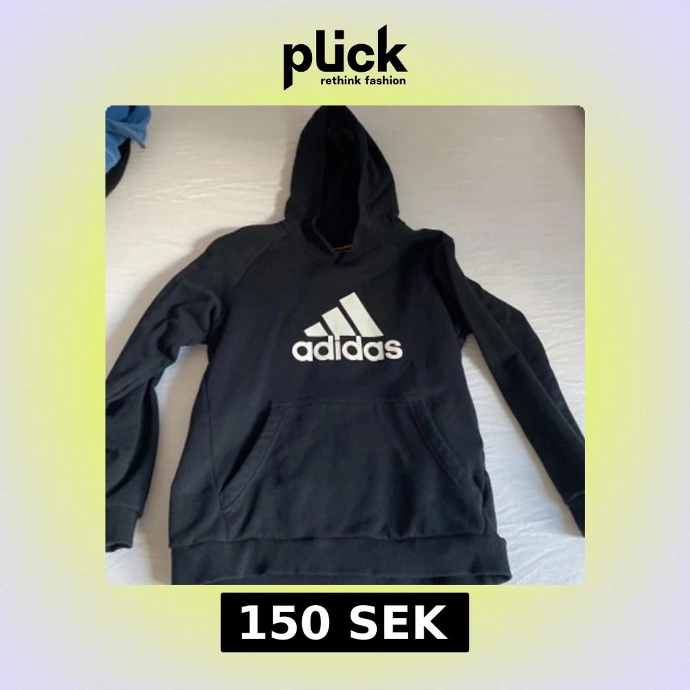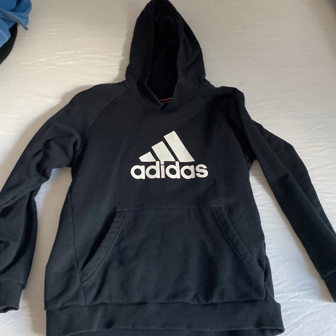 Svart hoodie från Adidas med stor vit logga framtill. Klassisk känguruficka och huva. Mjuk och skön i bomullsmix, perfekt för chill eller träning. Långärmad modell med ribbade muddar för extra komfort.