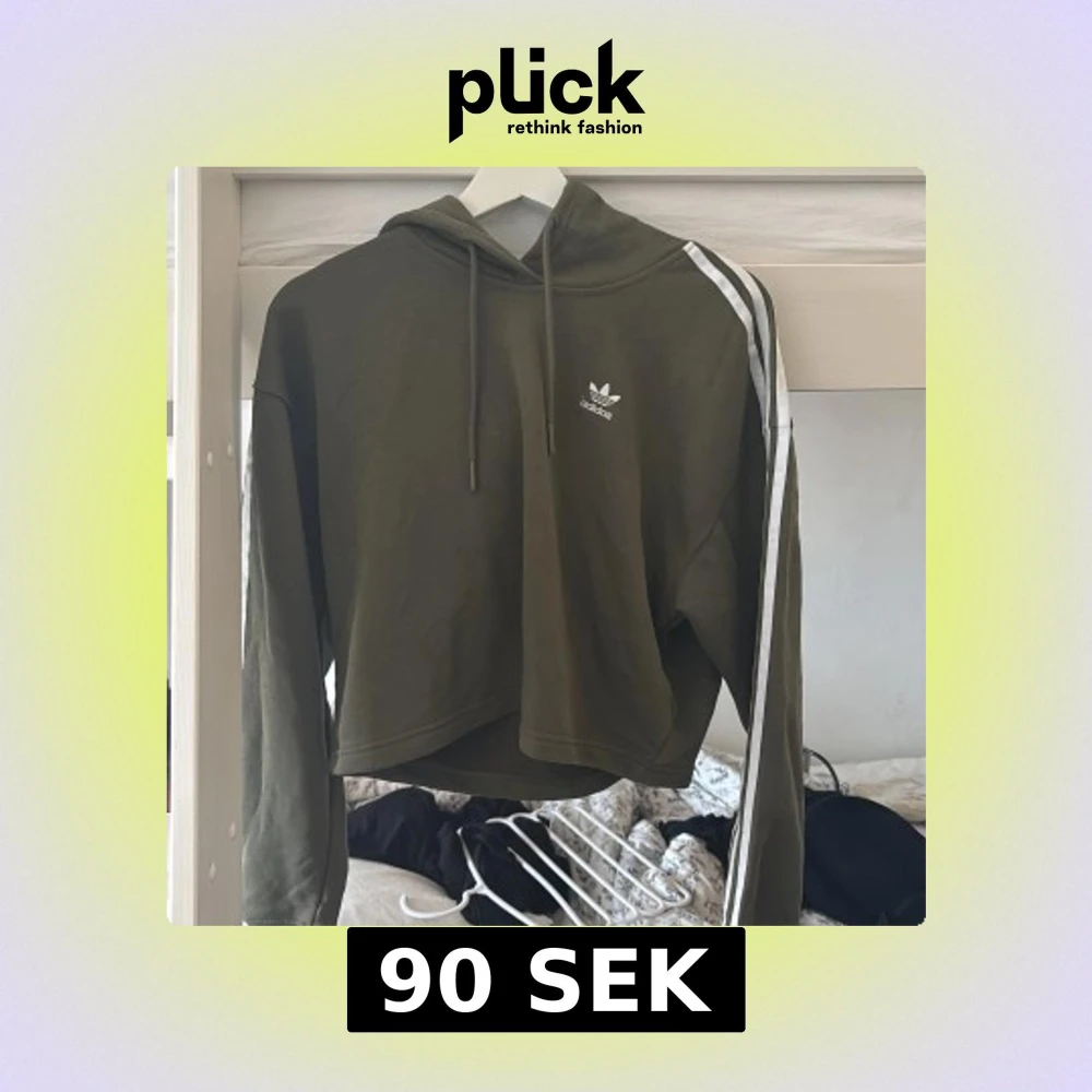 Säljer en snygg grön hoodie från Adidas med vita ränder på ärmarna och logga på bröstet. Hoodien har en croppad passform och dragsko i huvan. Perfekt för en avslappnad stil.