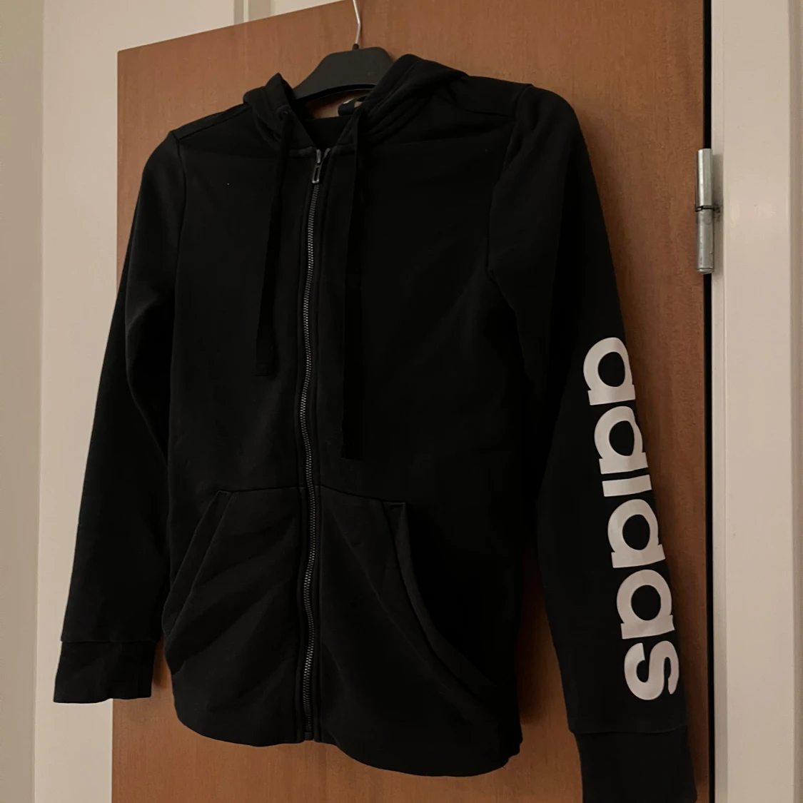 Säljer en svart hoodie från Adidas med dragkedja och luva. Adidas-loggan är tryckt i vitt på ena ärmen. Köpt för 669 på Zalando. Pris går att diskutera