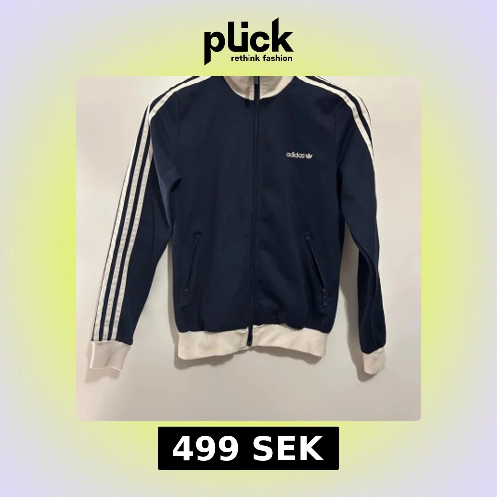 Klassisk Adidas Originals träningströja tre ränder längs ärmarna och Adidas-loggan broderad på bröstet. Jackan har en krage och muddar i ribbstickat material, samt dragkedja fram och fickor med dragkedja. Bra skick, storlek xs/s