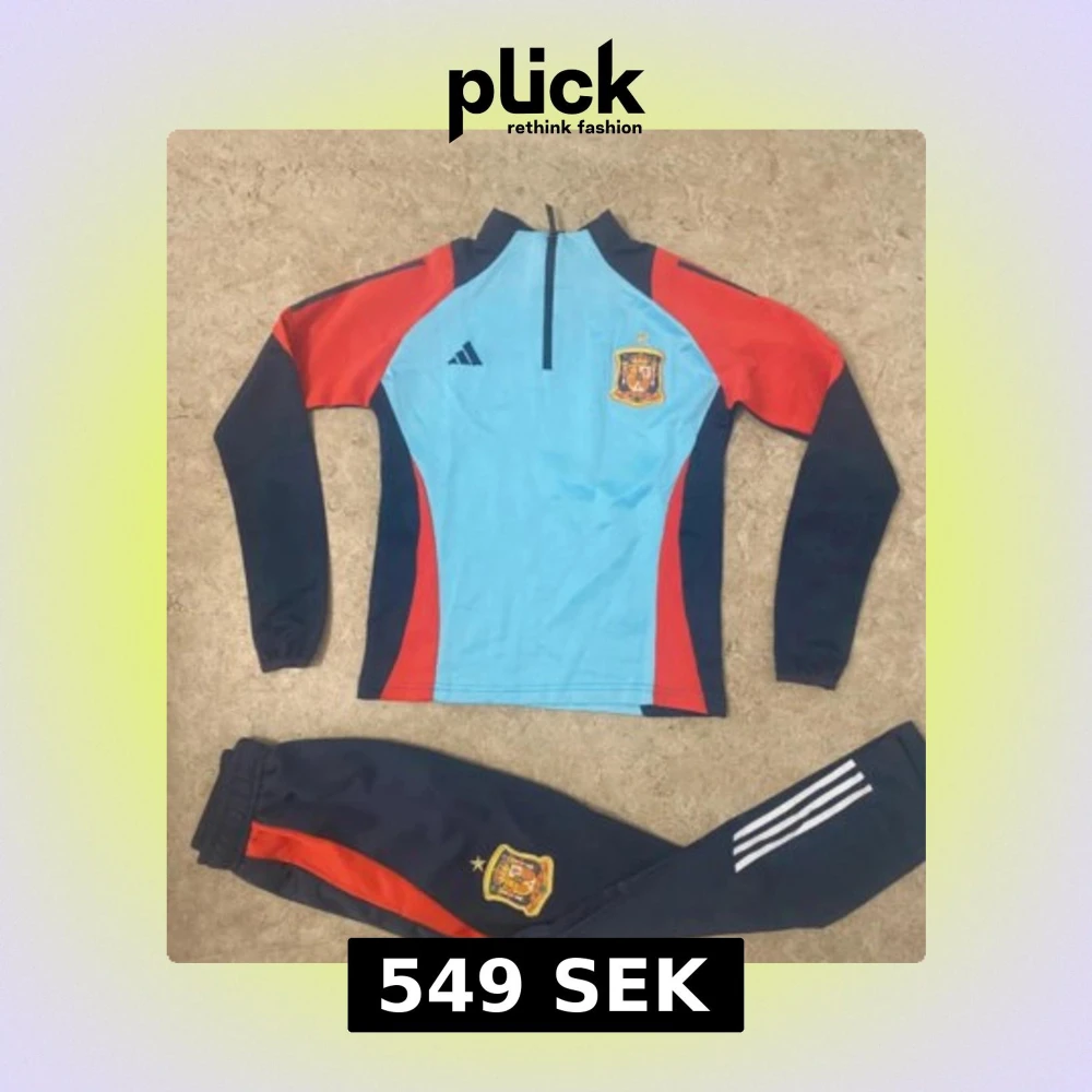 Säljer en långärmad träningströja från Adidas med Spaniens landslagsmärke. Tröjan är ljusblå med röda och mörkblå detaljer, har half zip och klassiska Adidas-ränder på axlarna. Perfekt för fotbollsträning eller chill. Matchande byxor ingår ej.