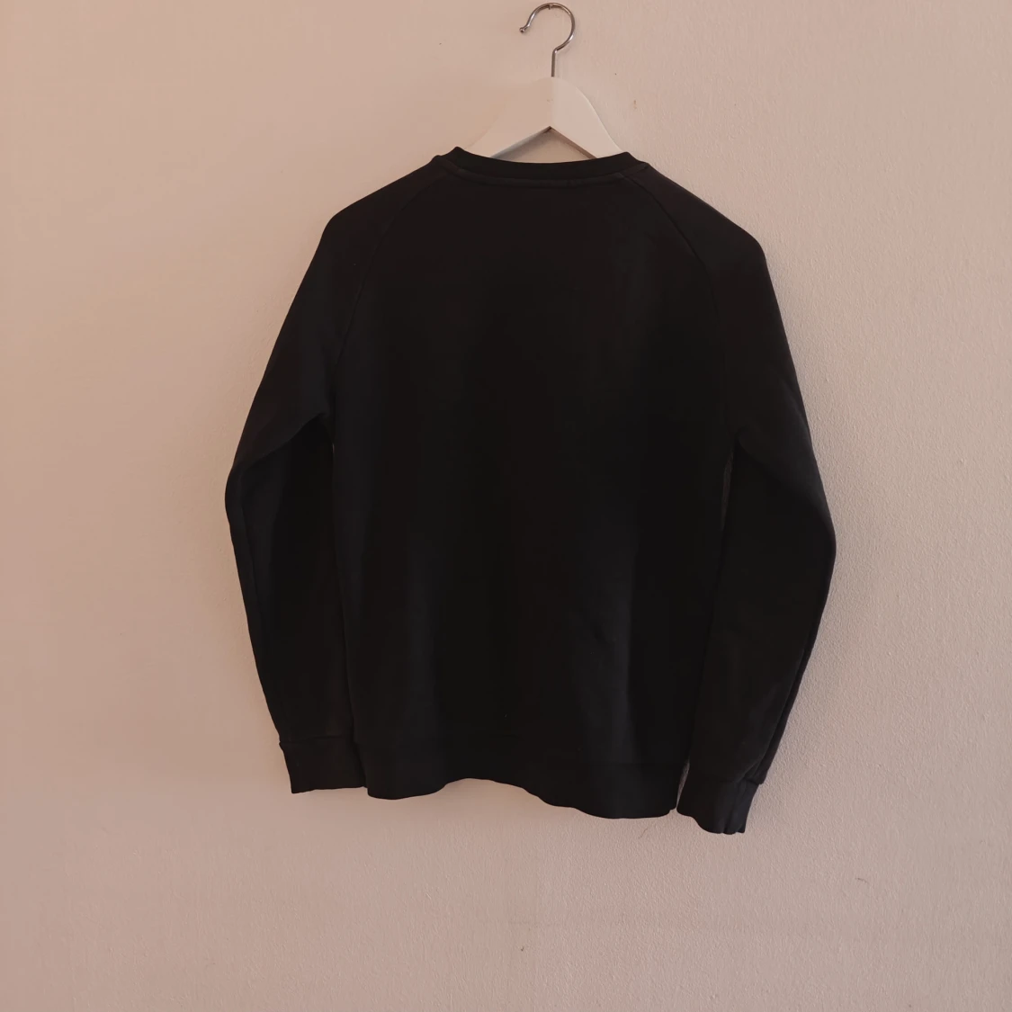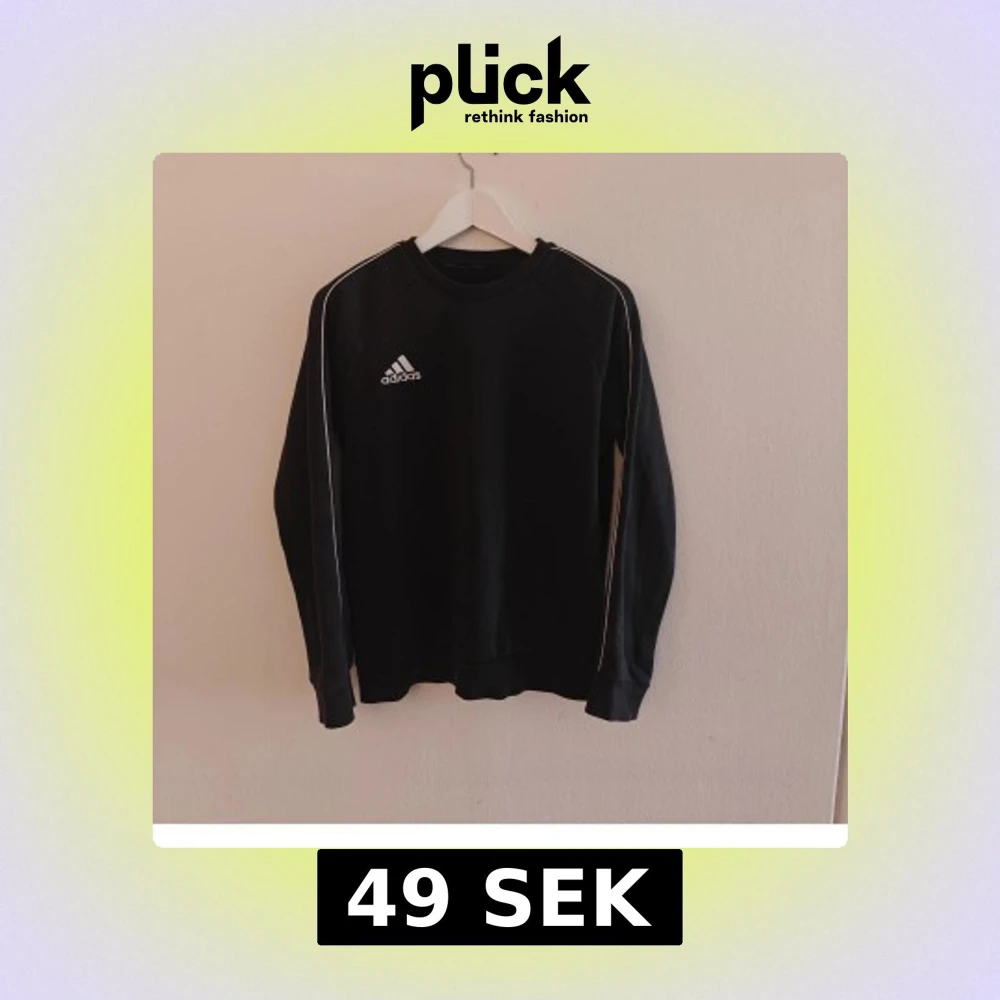 Svart långärmad sweatshirt från Adidas med broderad logga på bröstet och vita ränder längs ärmarna. Klassisk crewneck-modell i mjuk bomullsblandning, perfekt för en sportig och avslappnad stil.