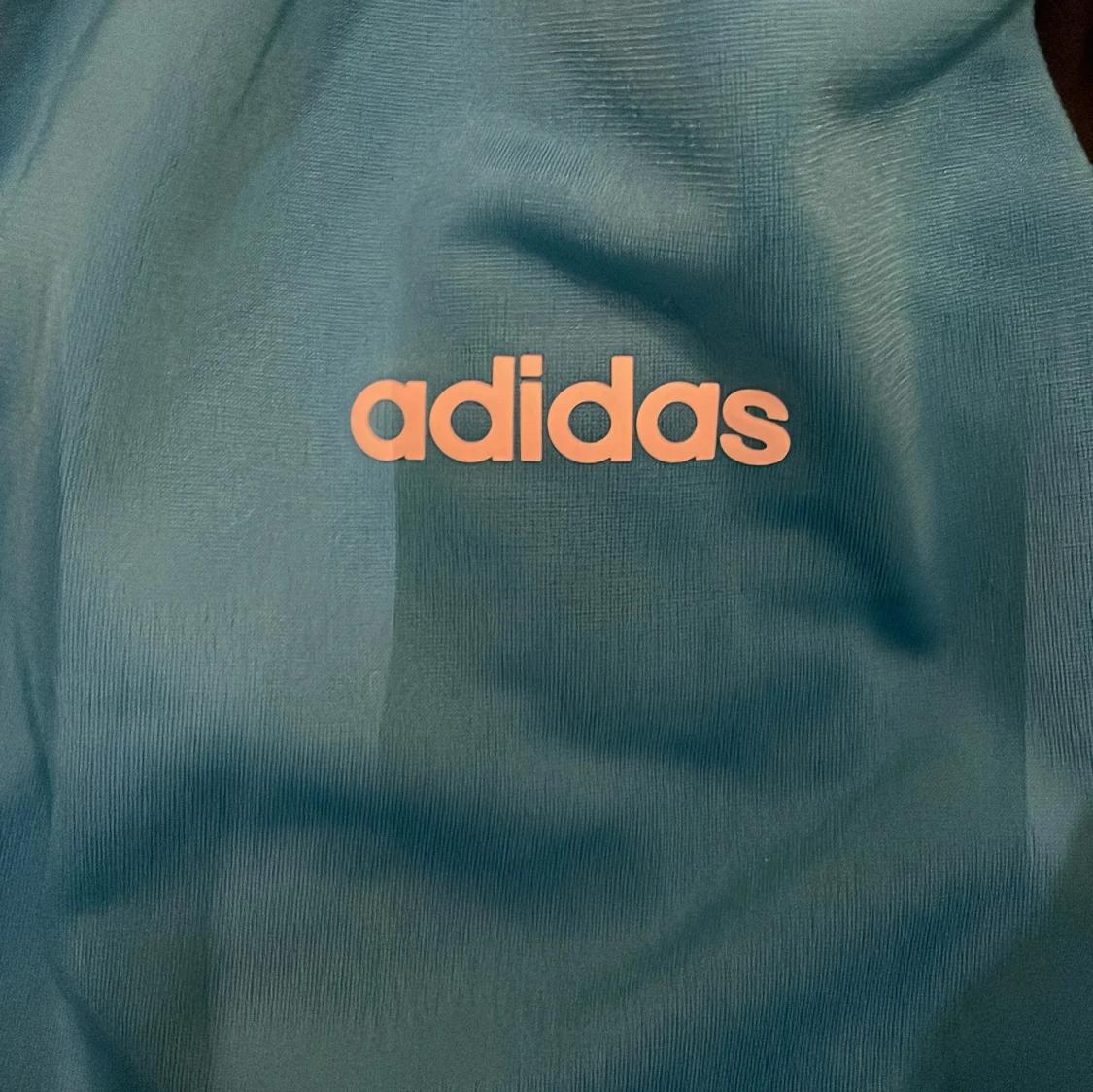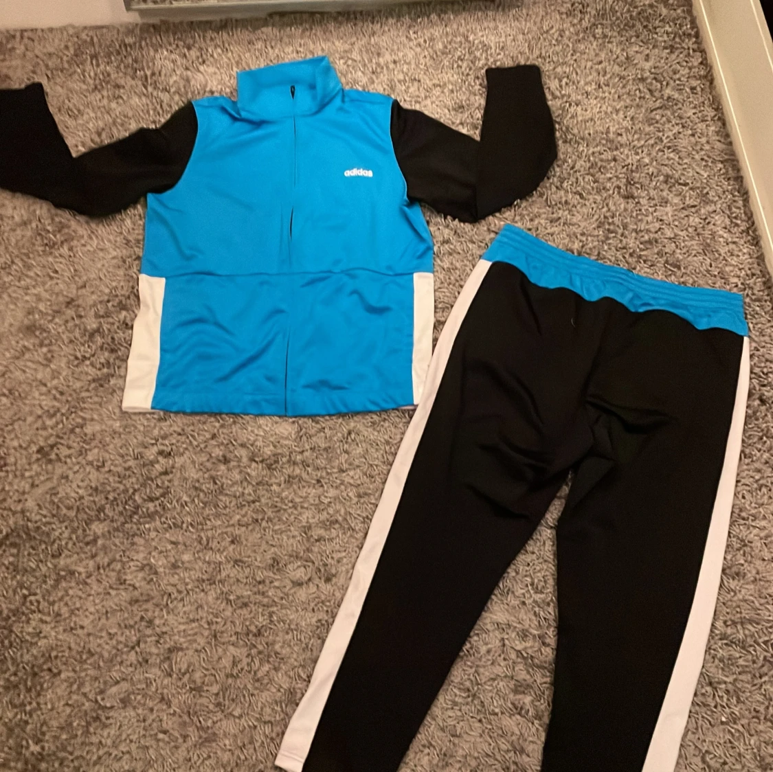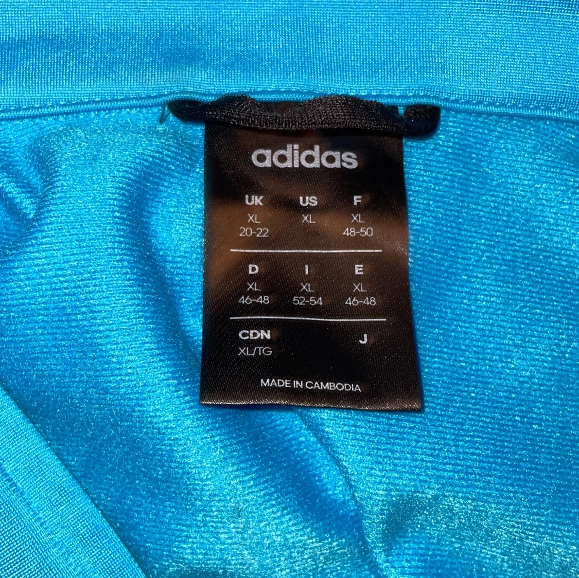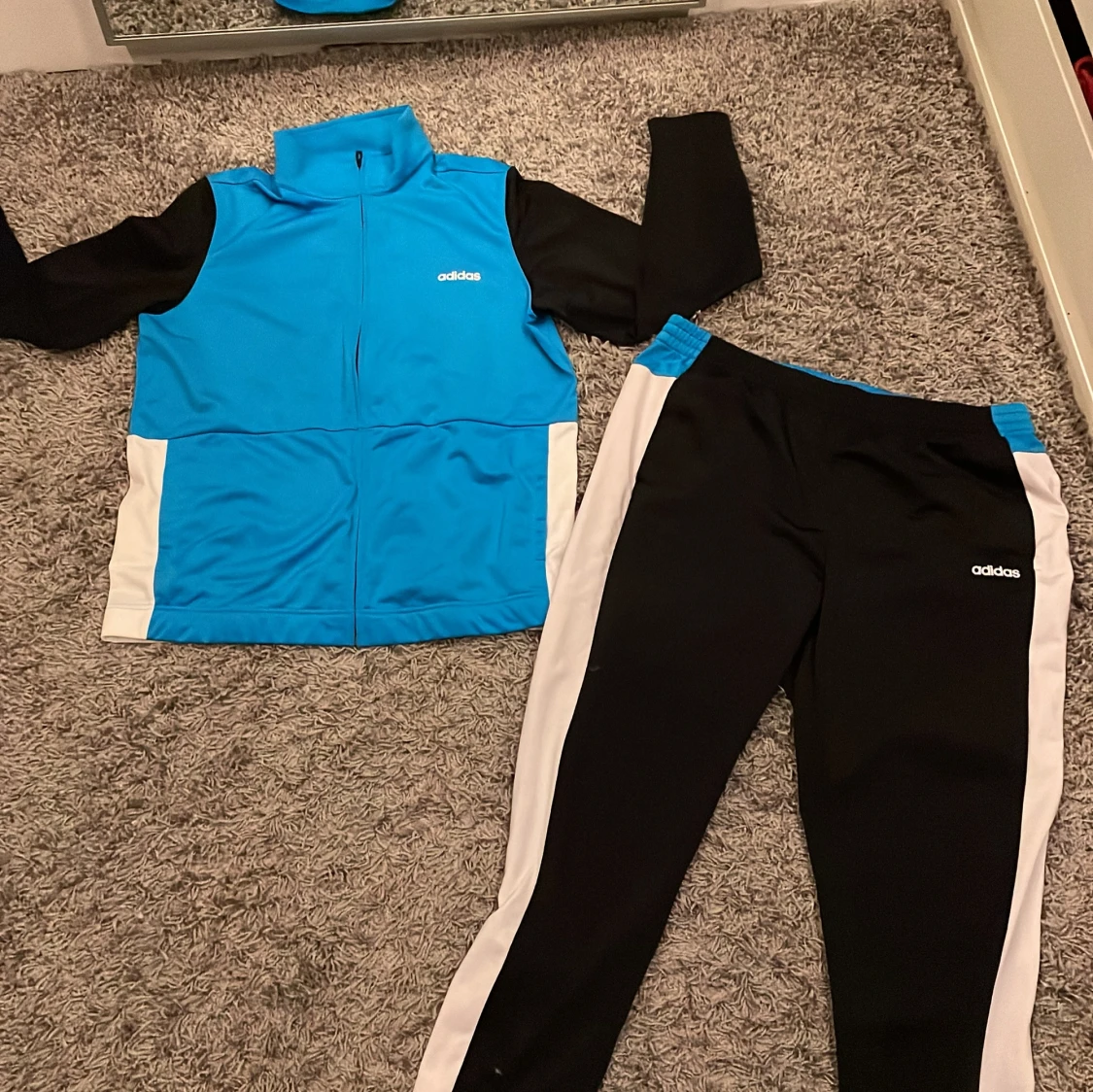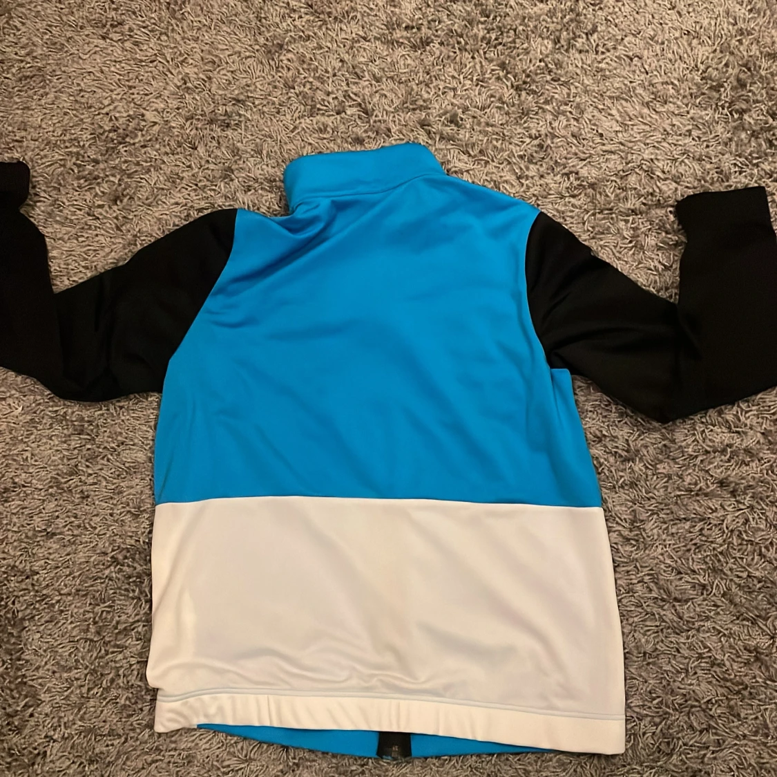 Säljer en snygg blå och svart träningsjacka från Adidas. Jackan har en dragkedja framtill och vita detaljer på sidorna. Perfekt för träning eller en sportig look. Adidas-loggan syns tydligt på bröstet.