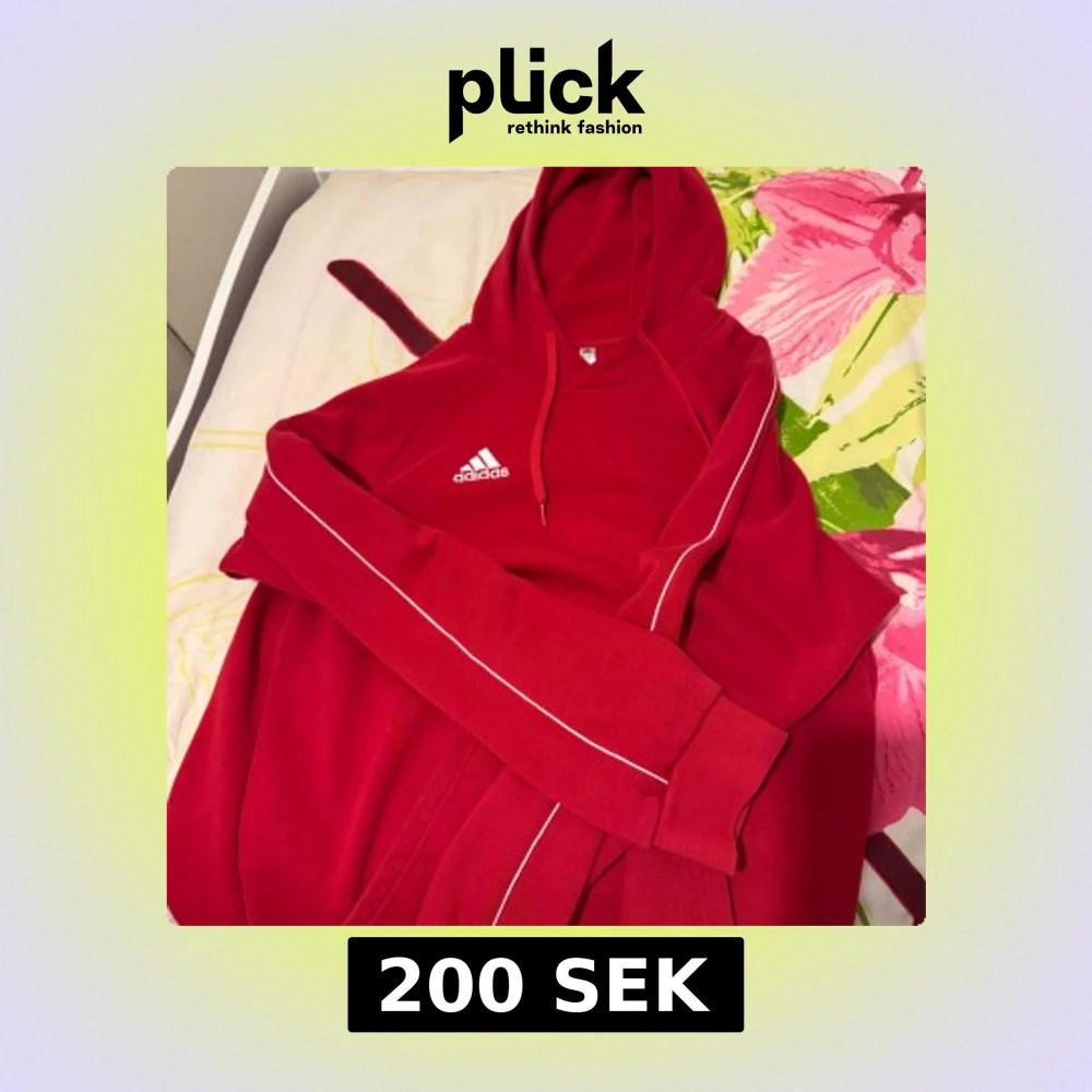 Säljer en röd hoodie från Adidas med vit logga på bröstet och vita detaljer längs ärmarna. Tröjan har huva och långa ärmar. Perfekt för en sportig och avslappnad stil. Den är lite baggy i storlek för folk som bär L som jag, tycker det är finare så