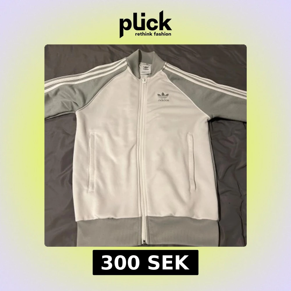 Säljer en klassisk Adidas track jacket i vitt och ljusgrått med dragkedja framtill. Jackan har de ikoniska tre ränderna längs ärmarna och två fickor med dragkedja. Perfekt för en sportig och avslappnad stil.