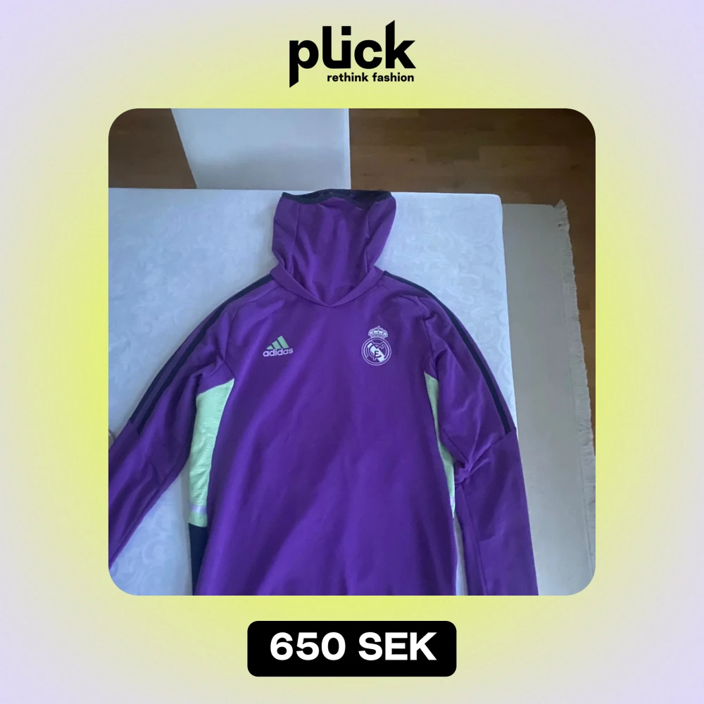 Säljer en snygg lila hoodie från Adidas med Real Madrid-logga på bröstet. Den har en cool design med svarta och ljusgröna detaljer. Perfekt för fotbollsfans som vill ha något bekvämt och stiligt. Passar bra till både träning och vardag. Storlek xs, passar 165-175. Nypris 1599kr
