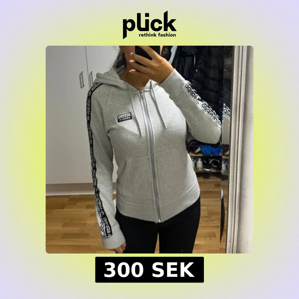 Snygg grå hoodie från Adidas med huva och hel dragkedja framtill. Svarta Adidas-loggor längs ärmarna ger en sportig vibe. Tröjan har två fickor fram och ribbade muddar. Perfekt för chill eller träning, riktigt skön och stilren.