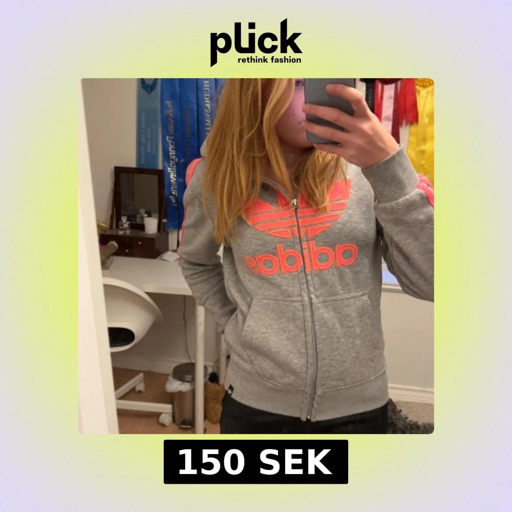 Säljer en grå hoodie från Adidas med stor rosa logga och dragkedja framtill. Tröjan har huva, långa ärmar med rosa detaljer på axlarna och två fickor. Perfekt för en sportig och avslappnad stil.