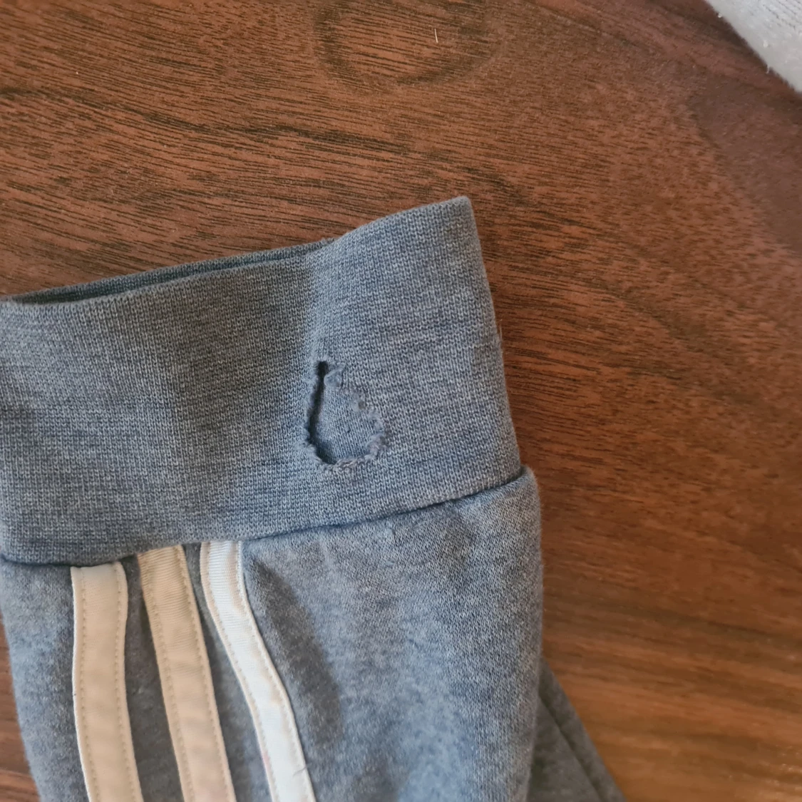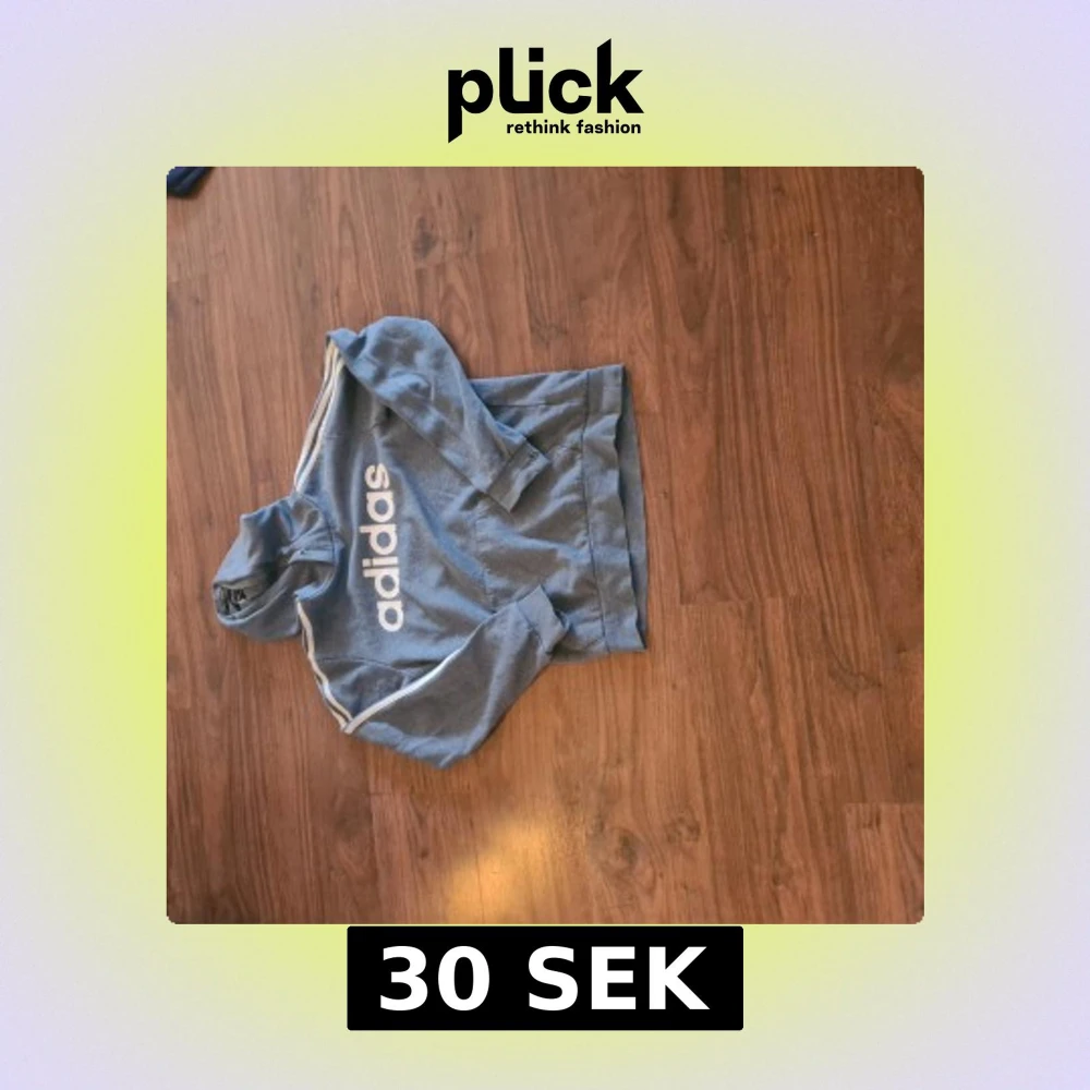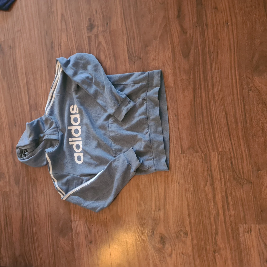 Säljer en blå tröja från Adidas med vita ränder längs ärmarna och stor logga på bröstet. Den har lite hål längst ut på ena ärmen, inget man tänker på!