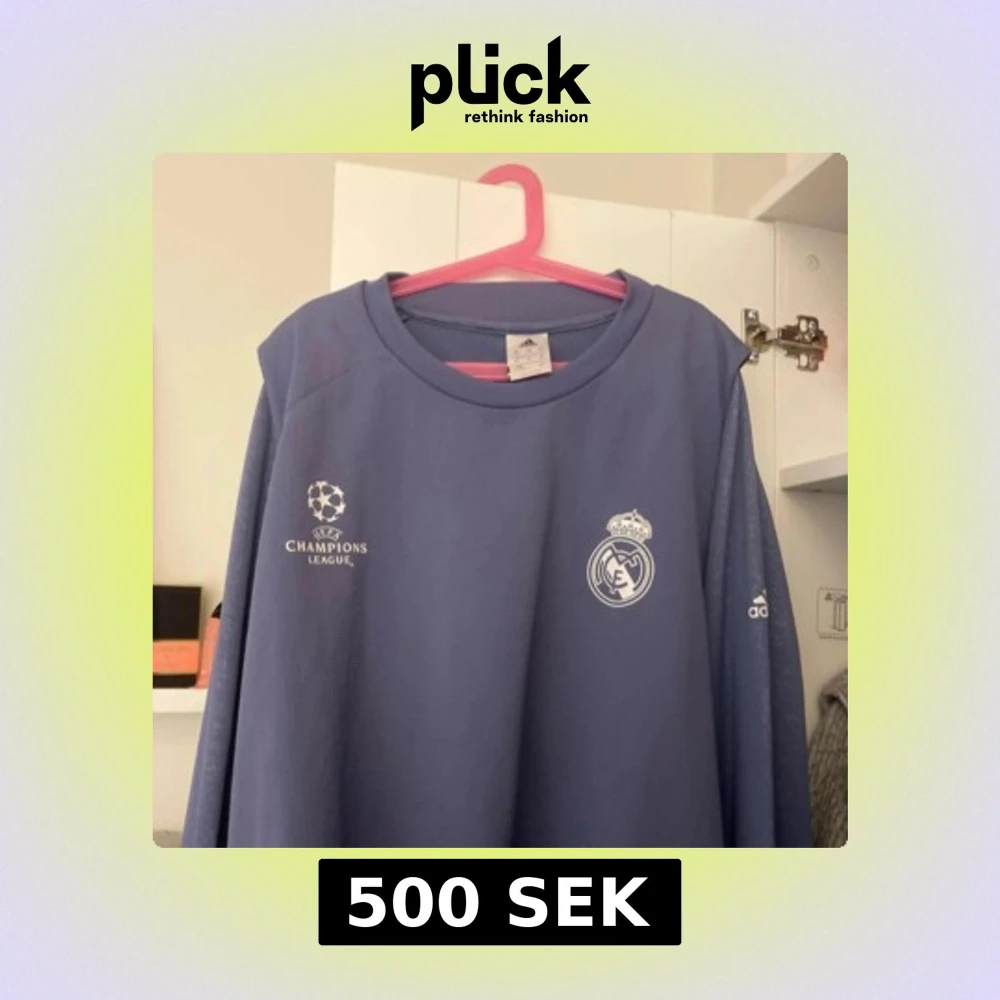 Säljer en ljuslila långärmad Real Madrid tröja från Adidas med Champions League-logga på bröstet. Tröjan har diskret mönster i tyget och är perfekt för fotbollsträning eller som supporterplagg.