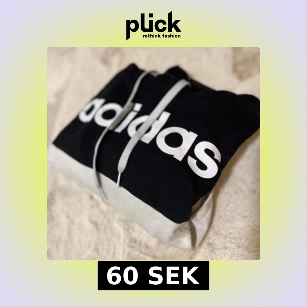 Säljer en snygg svart och vit hoodie från Adidas med stor logga på framsidan. Tröjan har långa ärmar med vita ränder längs sidorna och en praktisk huva med dragsko. Perfekt för en sportig look!