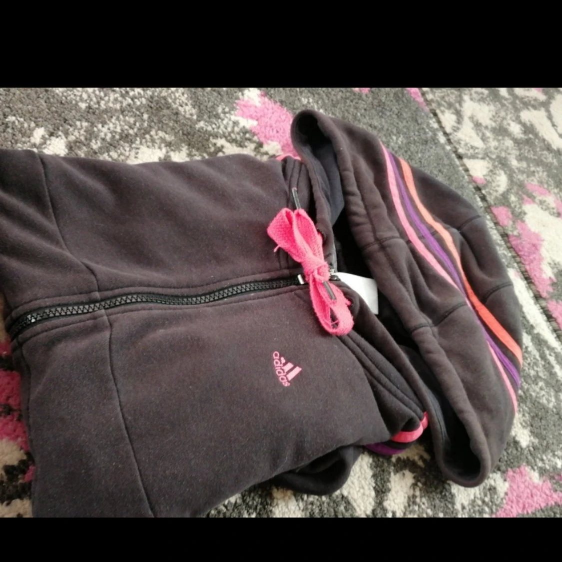 Adidas tröja i fint skick (missvisande färg på bilden) storlek xs kameran missvisar färgen på tröjan, den är svart med rosa lila streck. (Pris kan diskuteras)