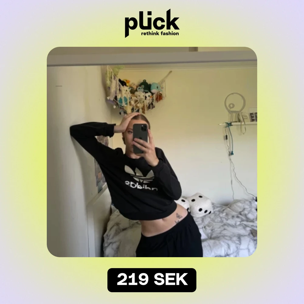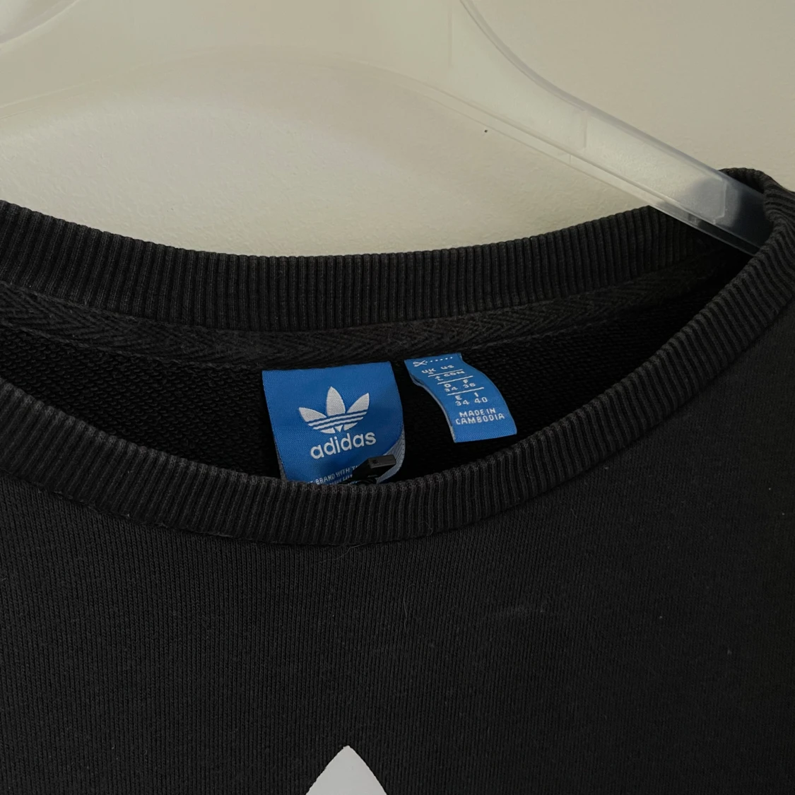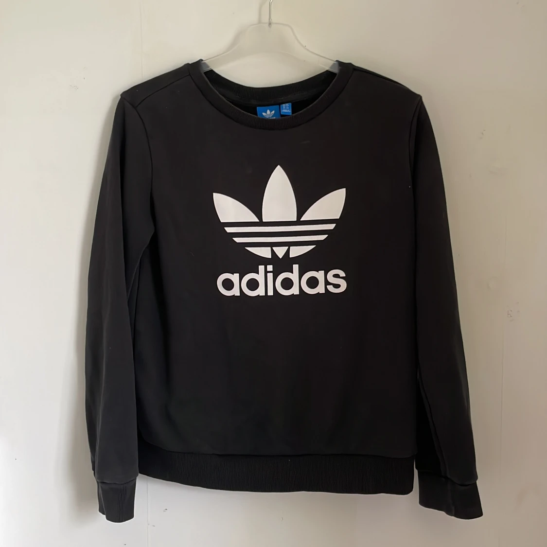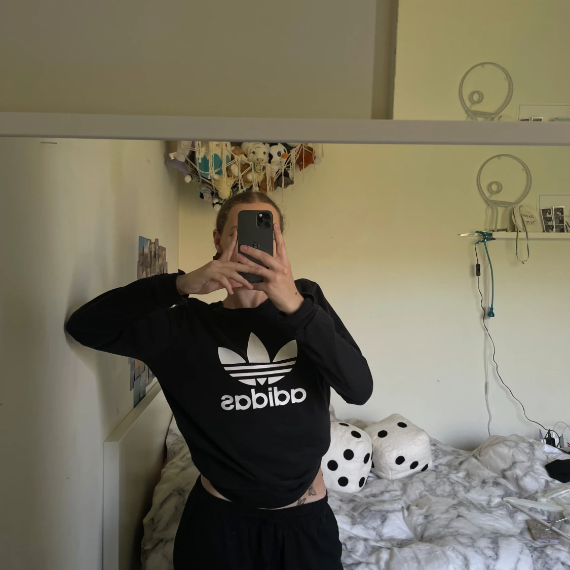 Säljer en svart sweatshirt från Adidas med deras ikoniska vita logga på framsidan. Tröjan är långärmad och gjord i ett mjukt bomullsmaterial, perfekt för en casual look. Den har en normal passform och är i nyskick. Perfekt för höst och vår!