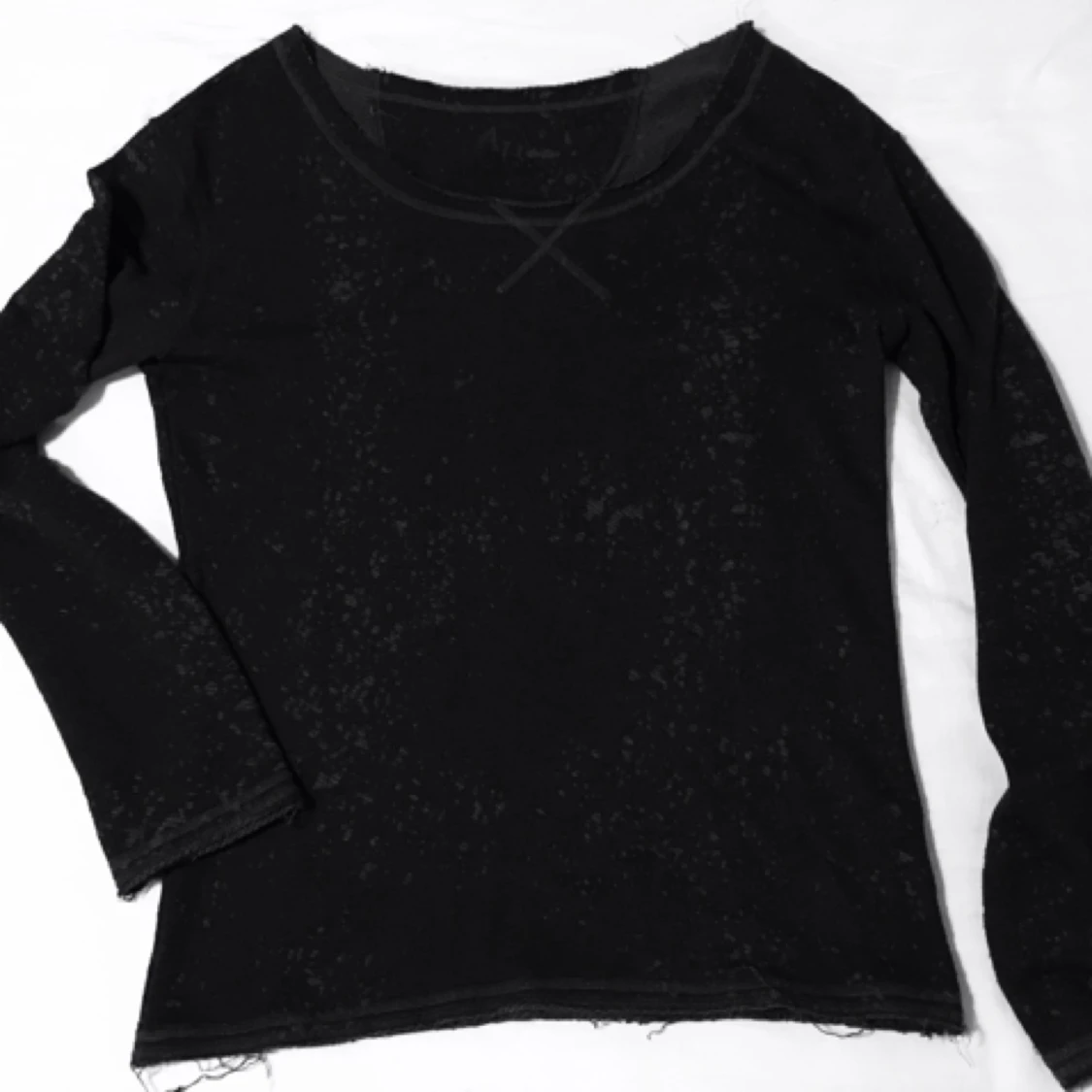 Mörkgrå Mjuk och lite mer hängande tröja med stor hals och detaljer i form utav stänk som är i ljusare grå ton. Alla tyg ändor är "klippta" och lite fransiga.
