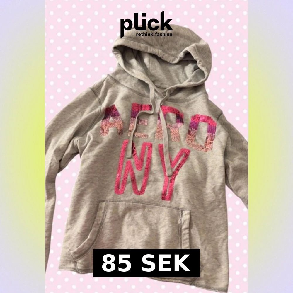 Säljer en grå hoodie från Aeropostale i storlek L. Tröjan har huva med snörning, magficka och stora bokstäver 'AERO NY' i rosa och lila paljetter på bröstet. Perfekt för dig som gillar lite extra bling på din vardagsstil.