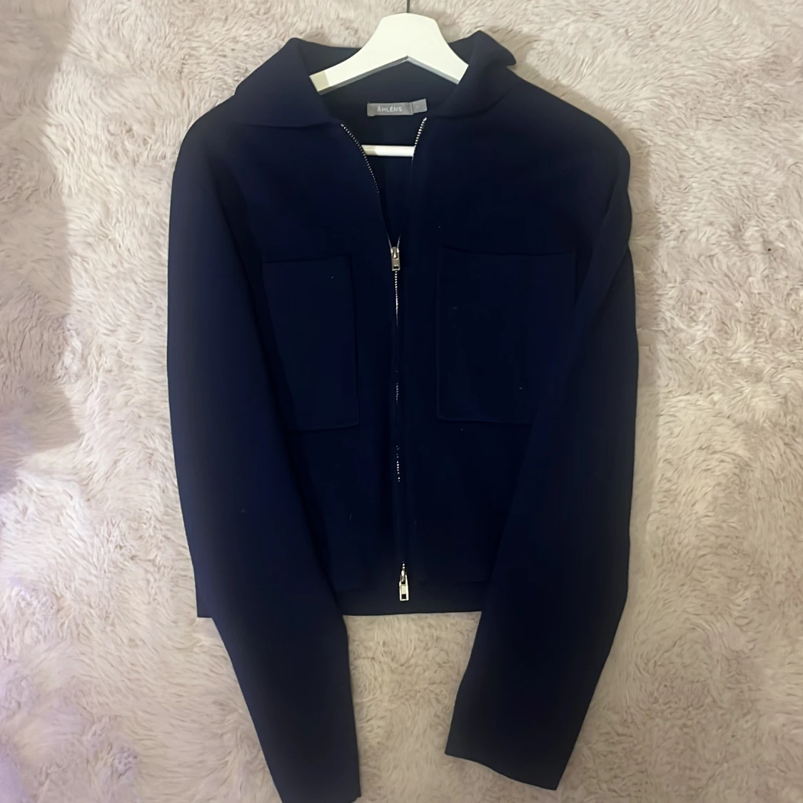 Säljer en stilren mörkblå jacka med dragkedja framtill. Jackan har långa ärmar och två stora fickor i fram. Perfekt för höst och vår, och ger en snygg look till vardagsoutfiten. Passar bra till både jeans och kjol!