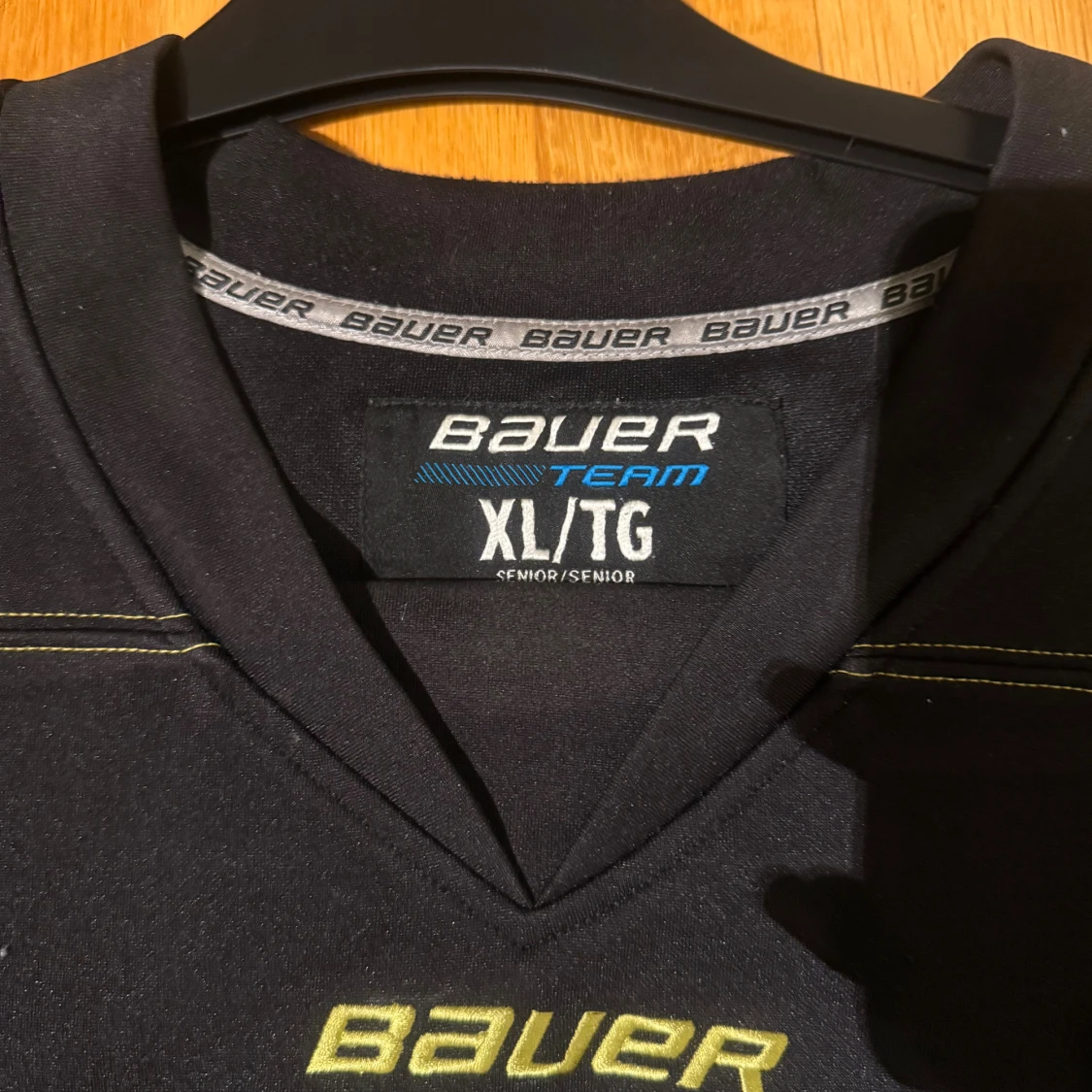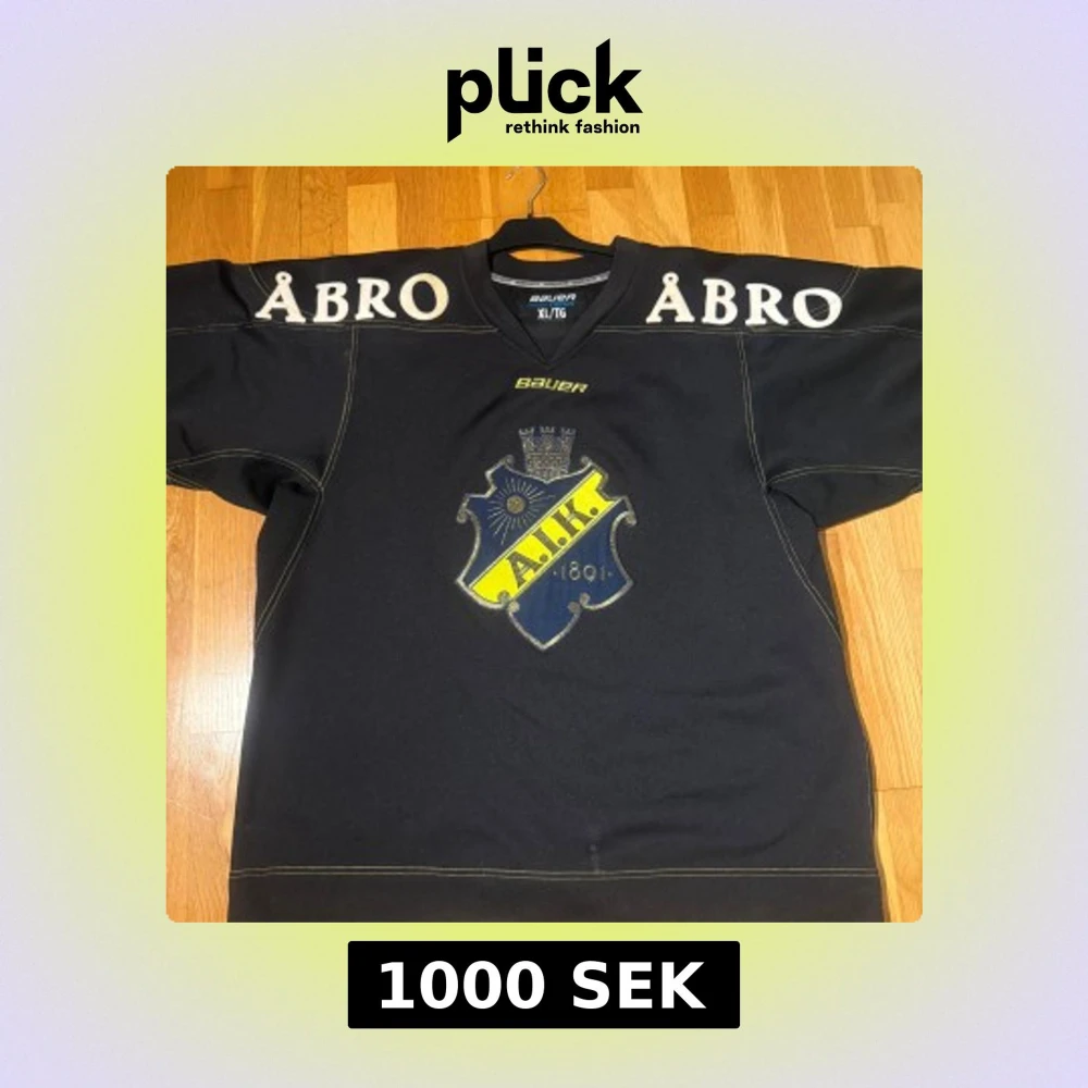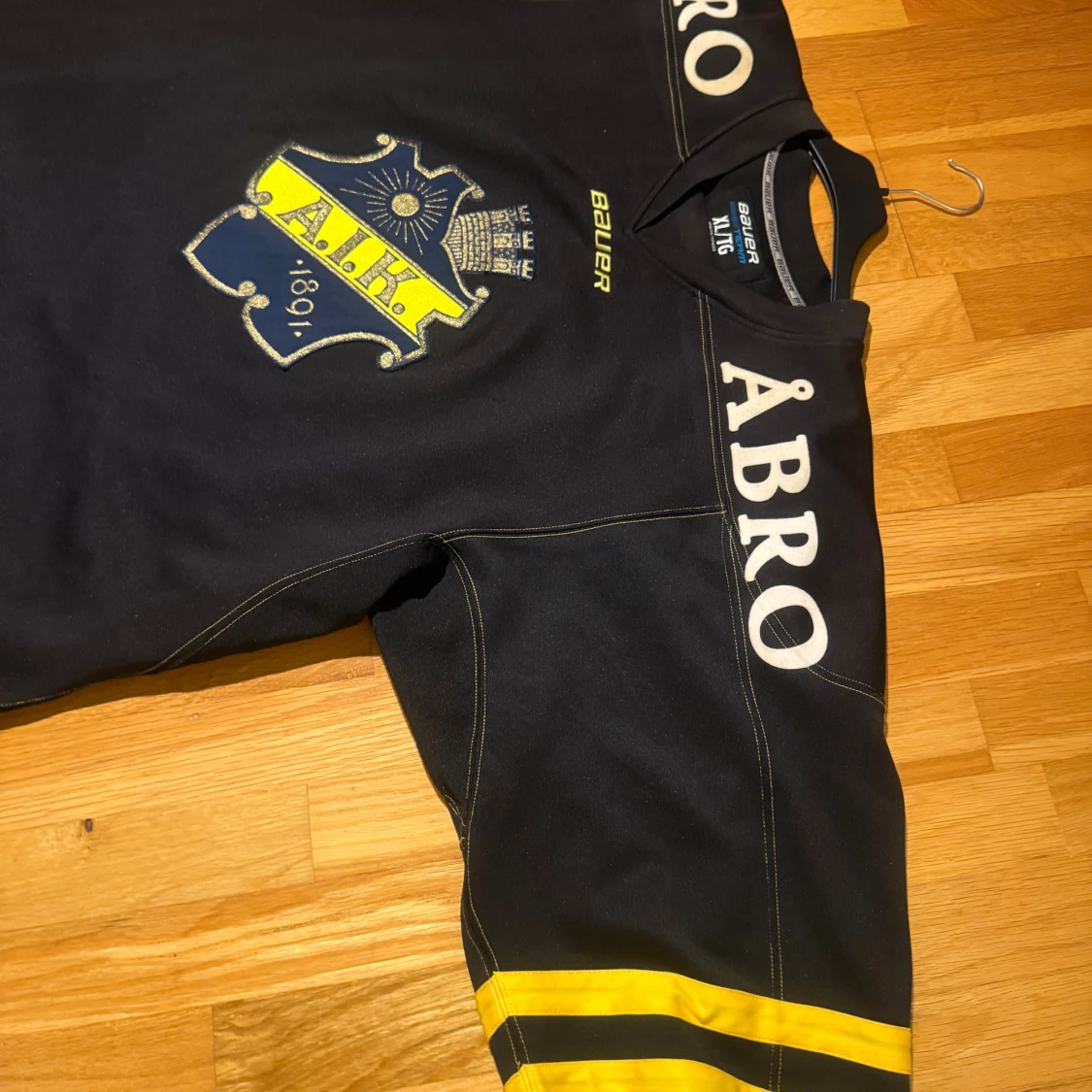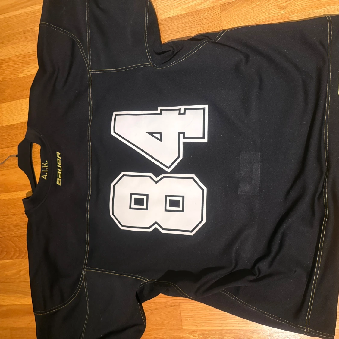 Säljer en svart AIK hockeytröja från Bauer i storlek XL. Tröjan har AIK:s klubbmärke på bröstet, stora vita siffror 84 på ryggen och gula detaljer på ärmarna. Broderad text Åbro på axlarna.