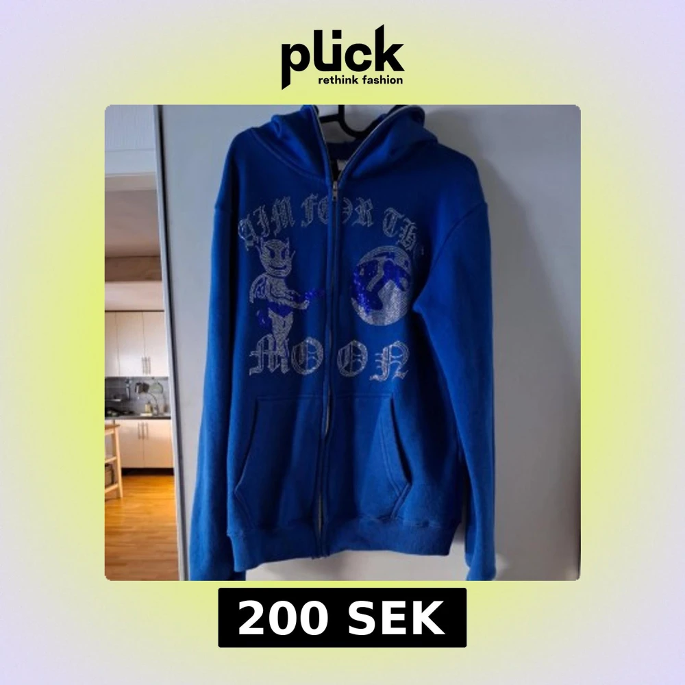 Skön och snygg blå rhinestone tröja från Aim for The Moon i storlek L. Tillverkad i mycket fint 100% franskt bomull och perfekt nu i kallare tider! Vid funderingar släng iväg ett dm. Mvh Theo 🤩