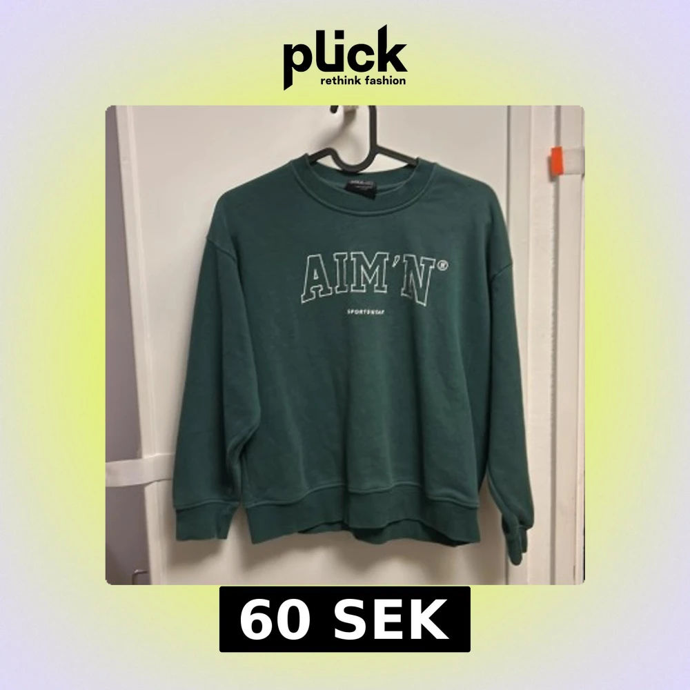 Säljer en grön sweatshirt från AIM'N med vit text på bröstet. Tröjan har rund hals, långa ärmar och en loose passform. Materialet är mjuk bomull blandat med polyester, perfekt för chill dagar eller träning. Klassisk college-stil som är enkel att matcha.