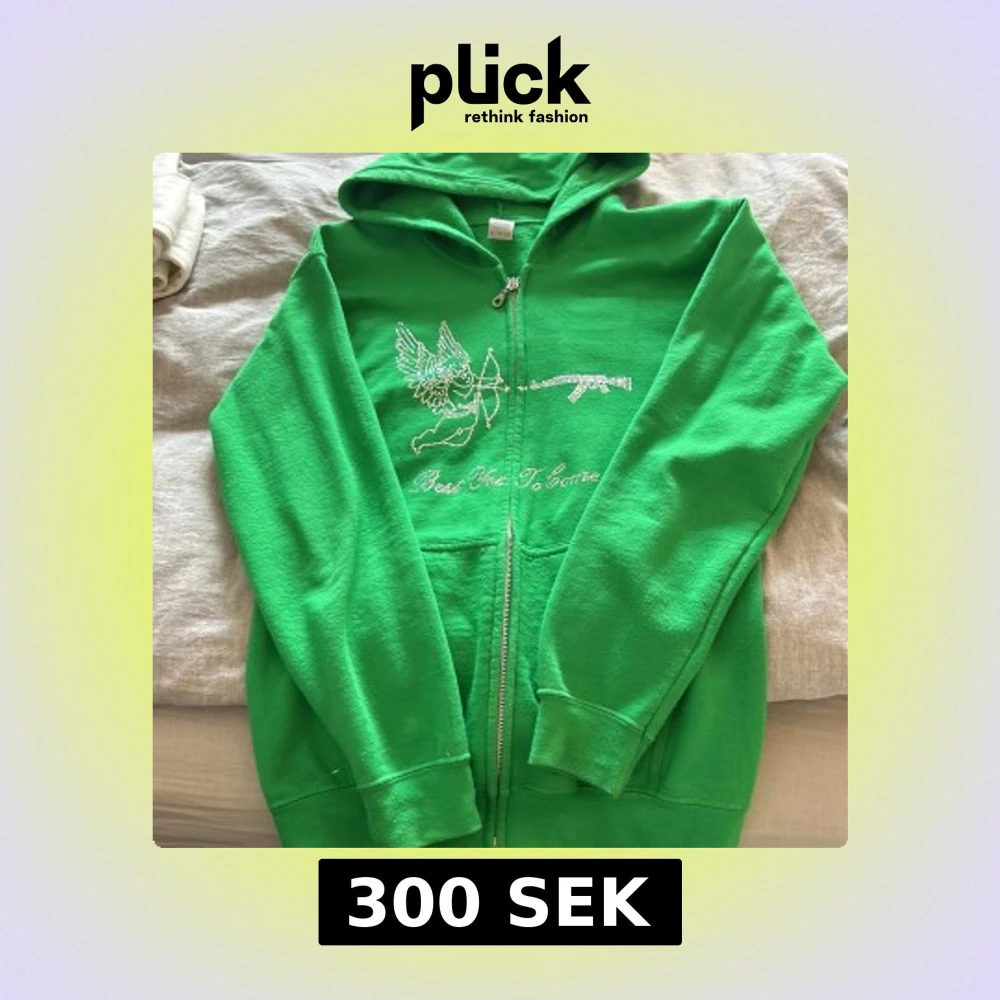 Säljer en grön hoodie med dragkedja och ett unikt tryck på framsidan. Hoodien har långa ärmar och en bekväm passform. Perfekt för en avslappnad stil.