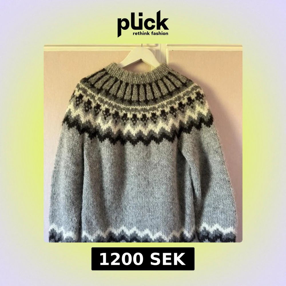 Säljer en klassisk isländsk stickad tröja från Álafoss i grått, svart och vitt. Tröjan har ett snyggt mönster runt oket och är gjord i 100% isländsk ull. Perfekt för kalla dagar med sin tjocka och mysiga känsla. Långärmad och med ribbad hals. Passar storlek XS/S.