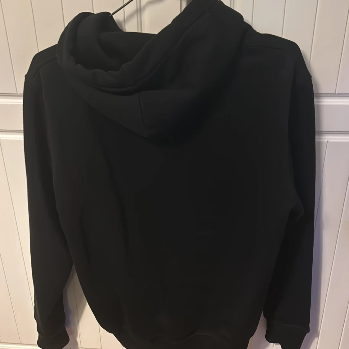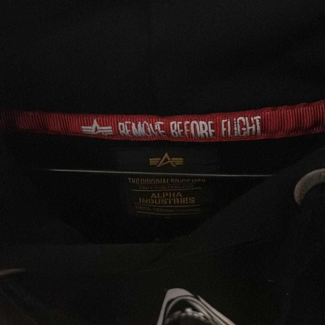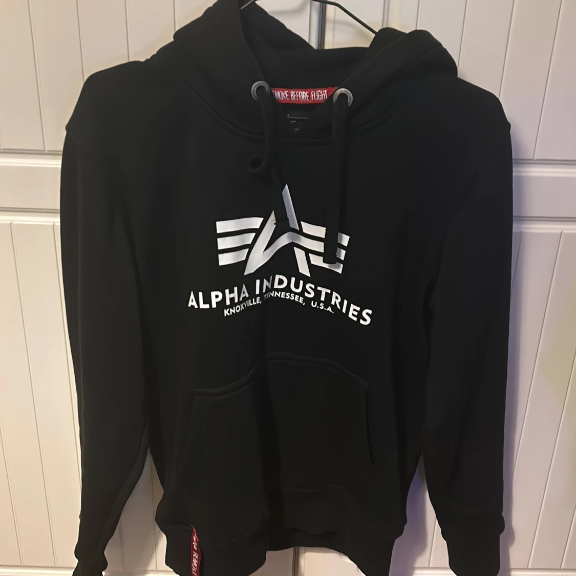 Snygg svart hoodie från Alpha Industries med deras ikoniska logga tryckt på framsidan. Tröjan har en klassisk känguruficka, riktigt skön tröja, har använt den några få gånger inga märken så som färg eller smuts.
