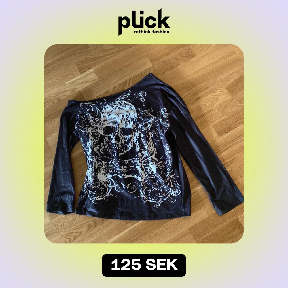 Cool svart långärmad topp med ett stort vitt dödskallemotiv på framsidan. Perfekt för en edgy look och passar bra till både jeans och kjol. Materialet känns mjukt och bekvämt, perfekt för höst och vår. Toppen har en normal passform och är i mycket bra skick.