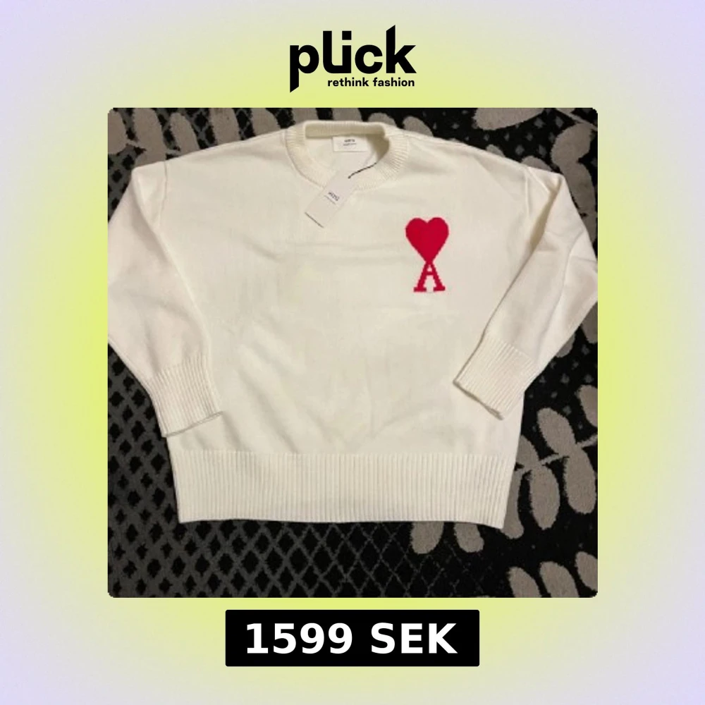 Vit stickad tröja från Ami Paris med röd hjärtlogga och bokstaven A på bröstet. Tröjan har rund halsringning, ribbade muddar och är långärmad. Perfekt för dig som gillar stilrena plagg med en twist.