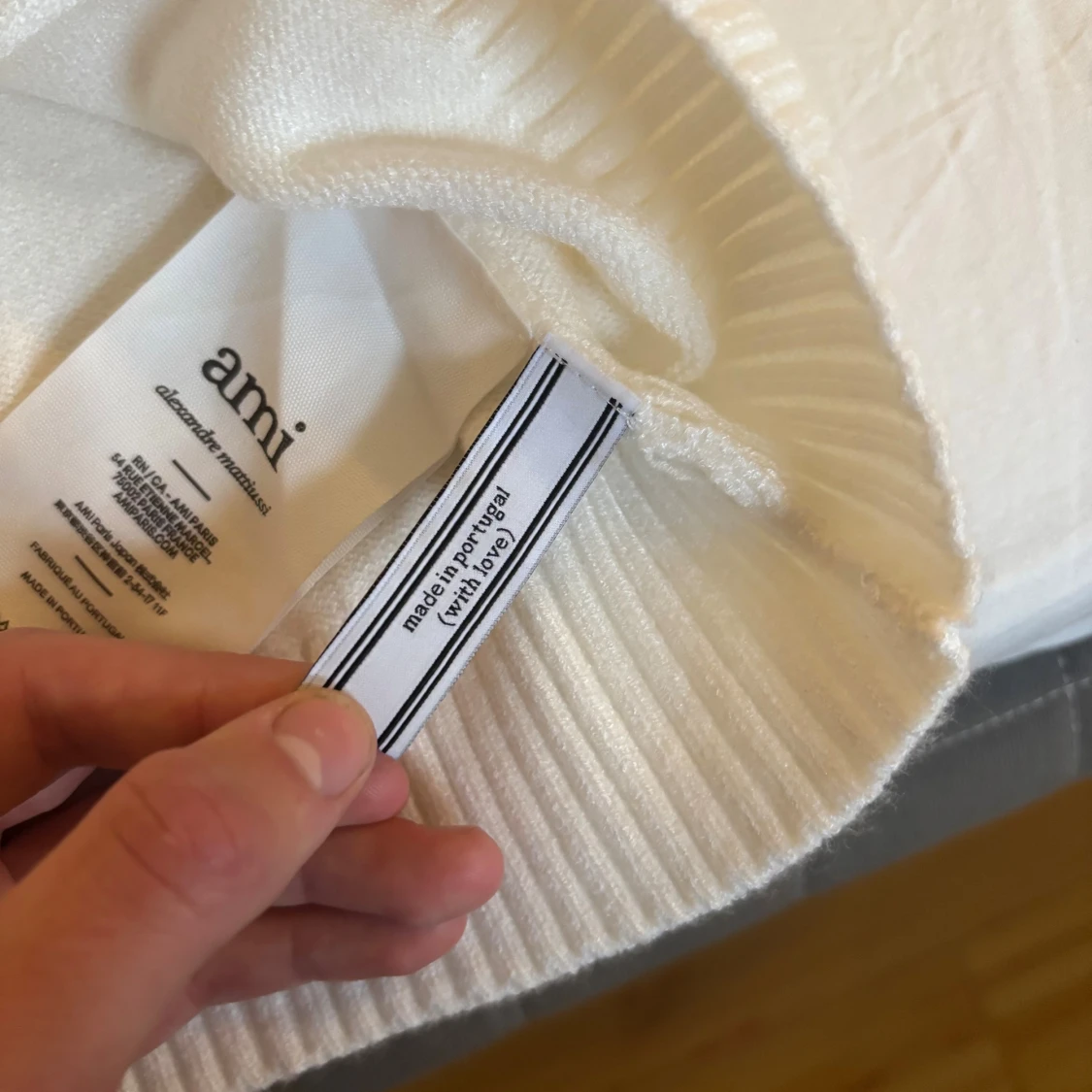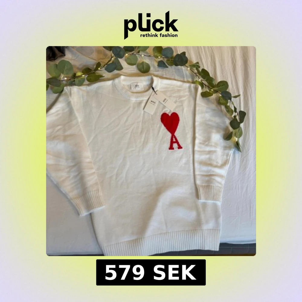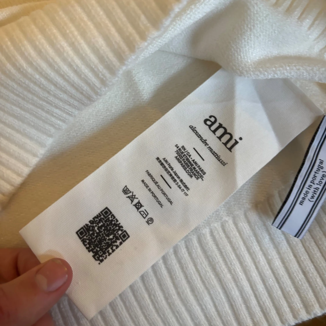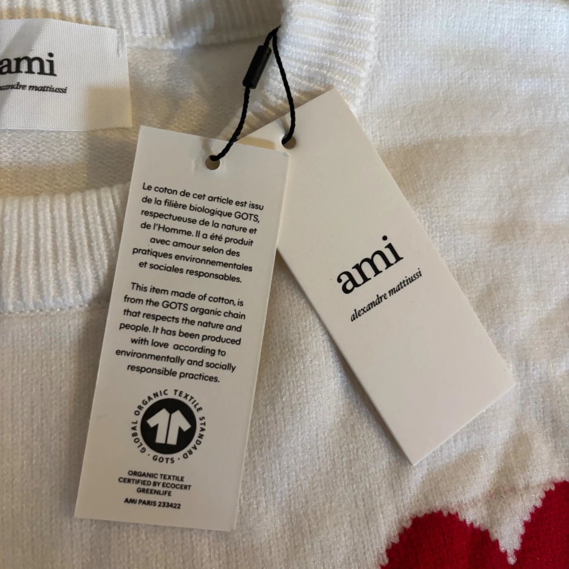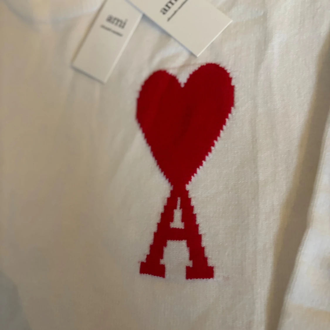 Vit stickad tröja från Ami Paris med röd hjärtlogga och bokstaven A på bröstet. Tröjan har rund hals, ribbade muddar och är långärmad. Perfekt för dig som gillar stilrena plagg med en twist.