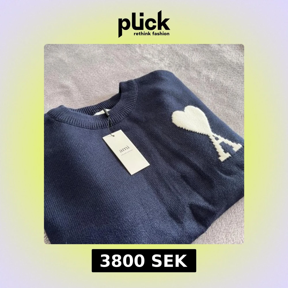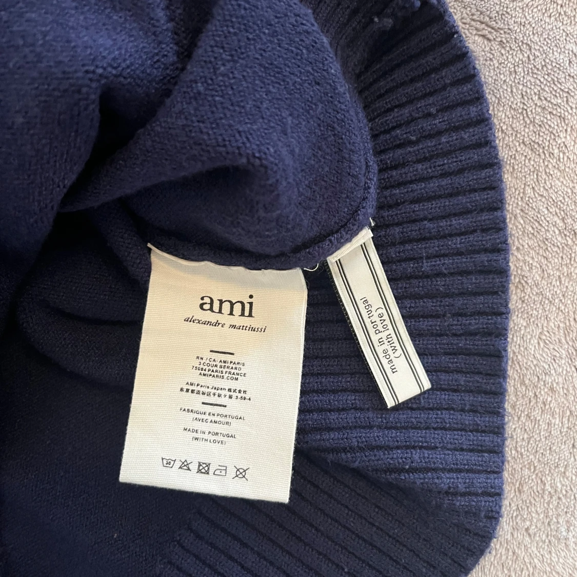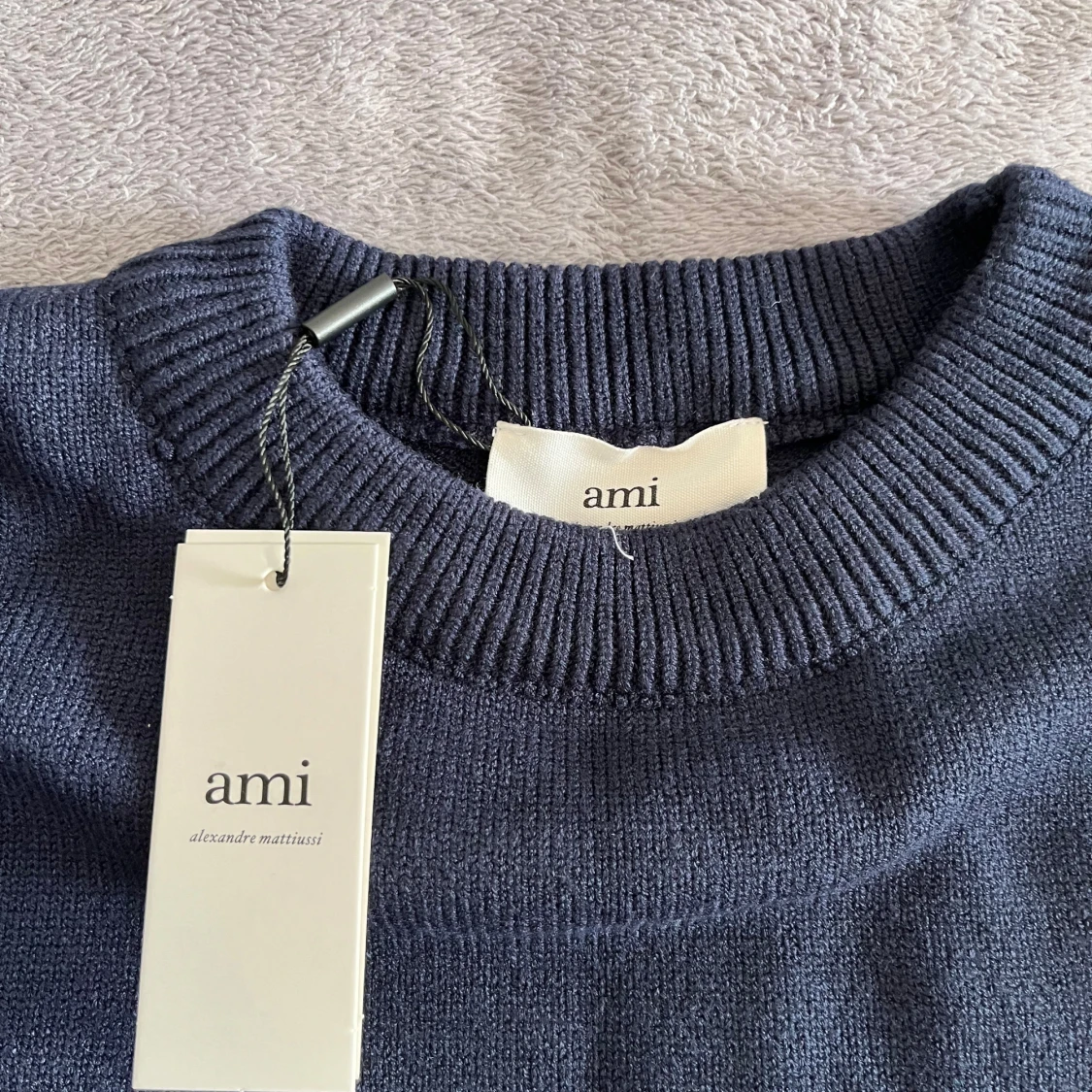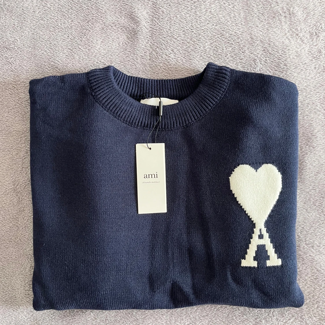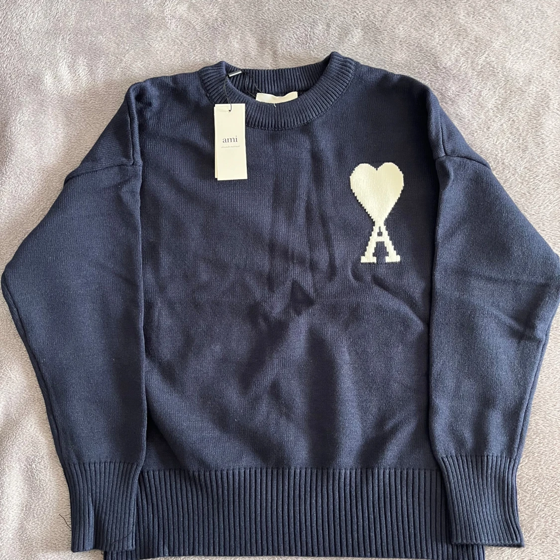 Snygg mörkblå stickad tröja från Ami med vit hjärtlogga på bröstet. Tröjan har rund halsringning, ribbade muddar och är långärmad. Perfekt för dig som vill ha en stilren och trendig look.