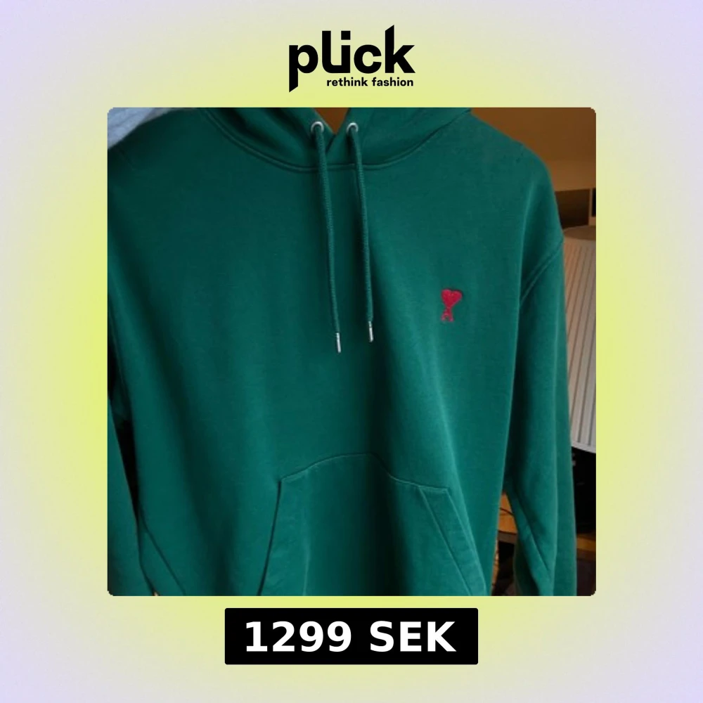 Snygg grön hoodie från Ami Paris med röd broderad hjärtdetalj på bröstet. Tröjan har huva med snörning, stor magficka och ribbade muddar. Perfekt för dig som gillar stilrena och coola plagg med en twist. Nypris runt 2000! Kan skicka fler bilder om frågan finns. Öppen för prisförslag!