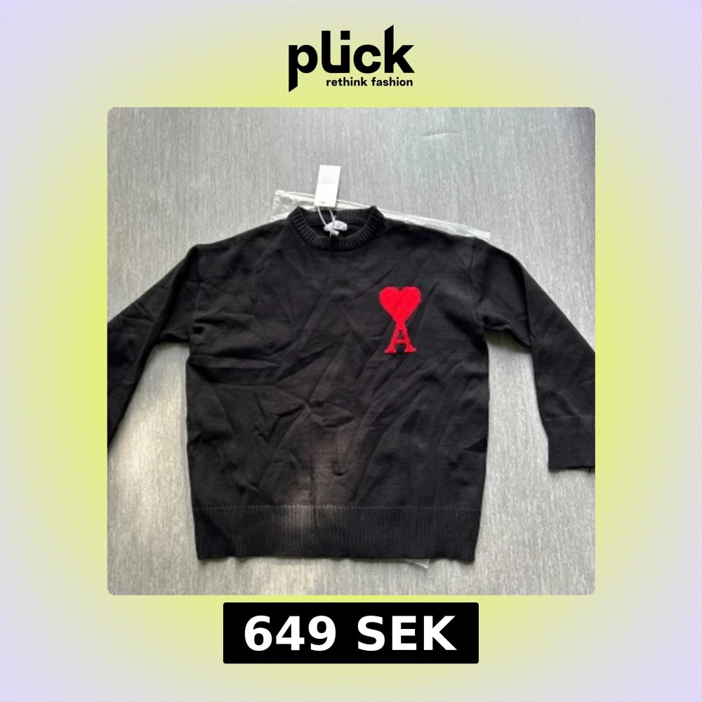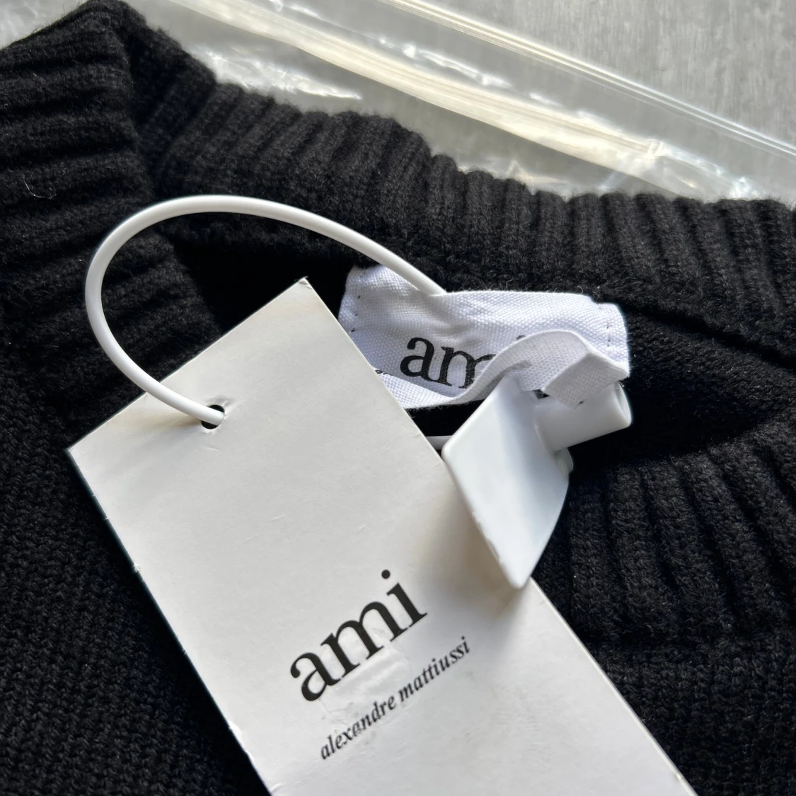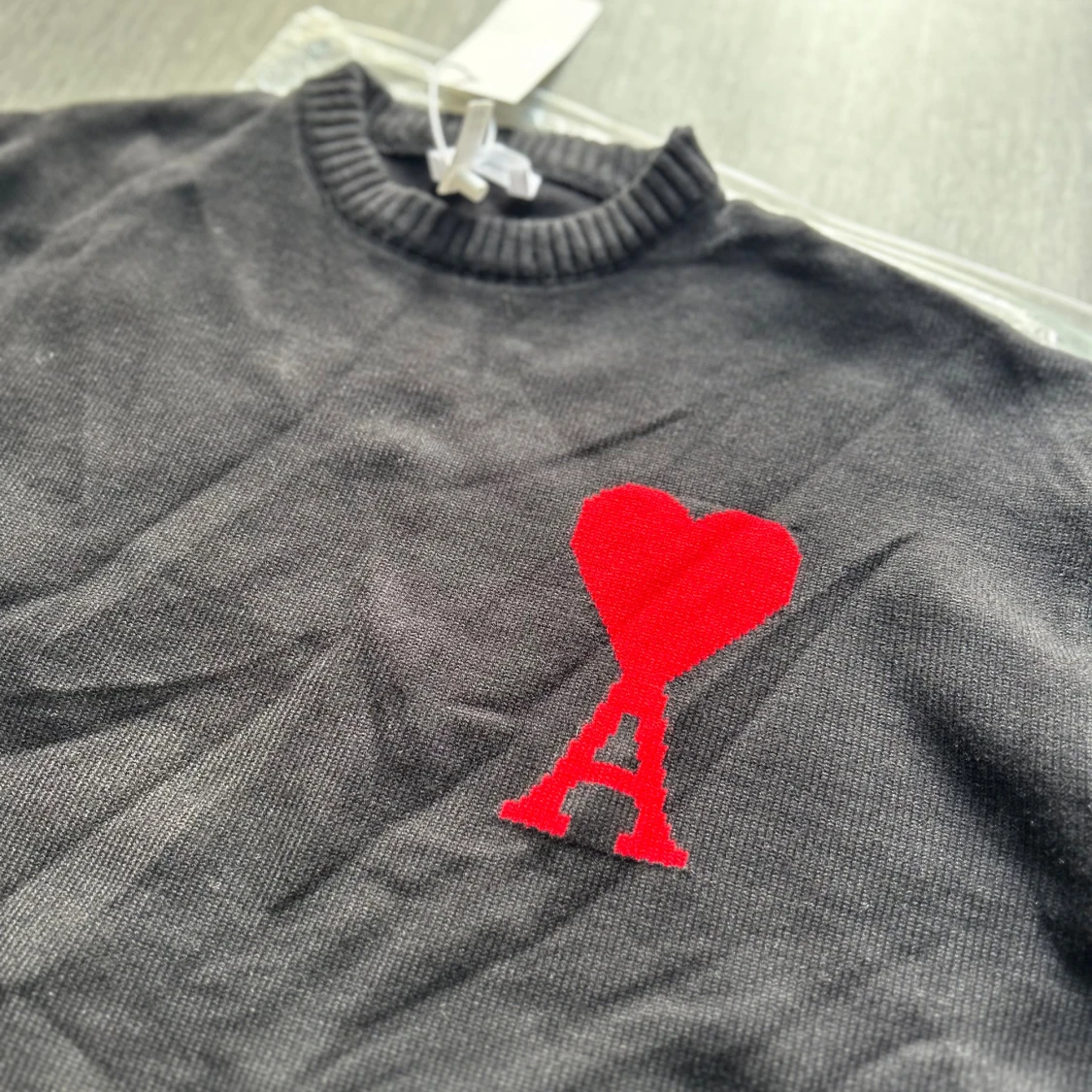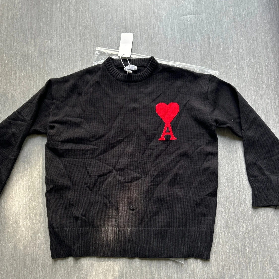Svart stickad tröja från Ami Paris med rund halsringning och ribbade muddar. På bröstet finns ett rött hjärta med bokstaven A, helt ny