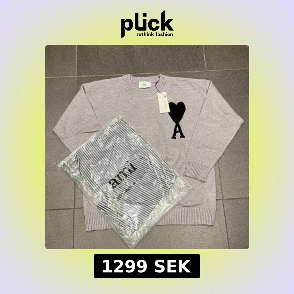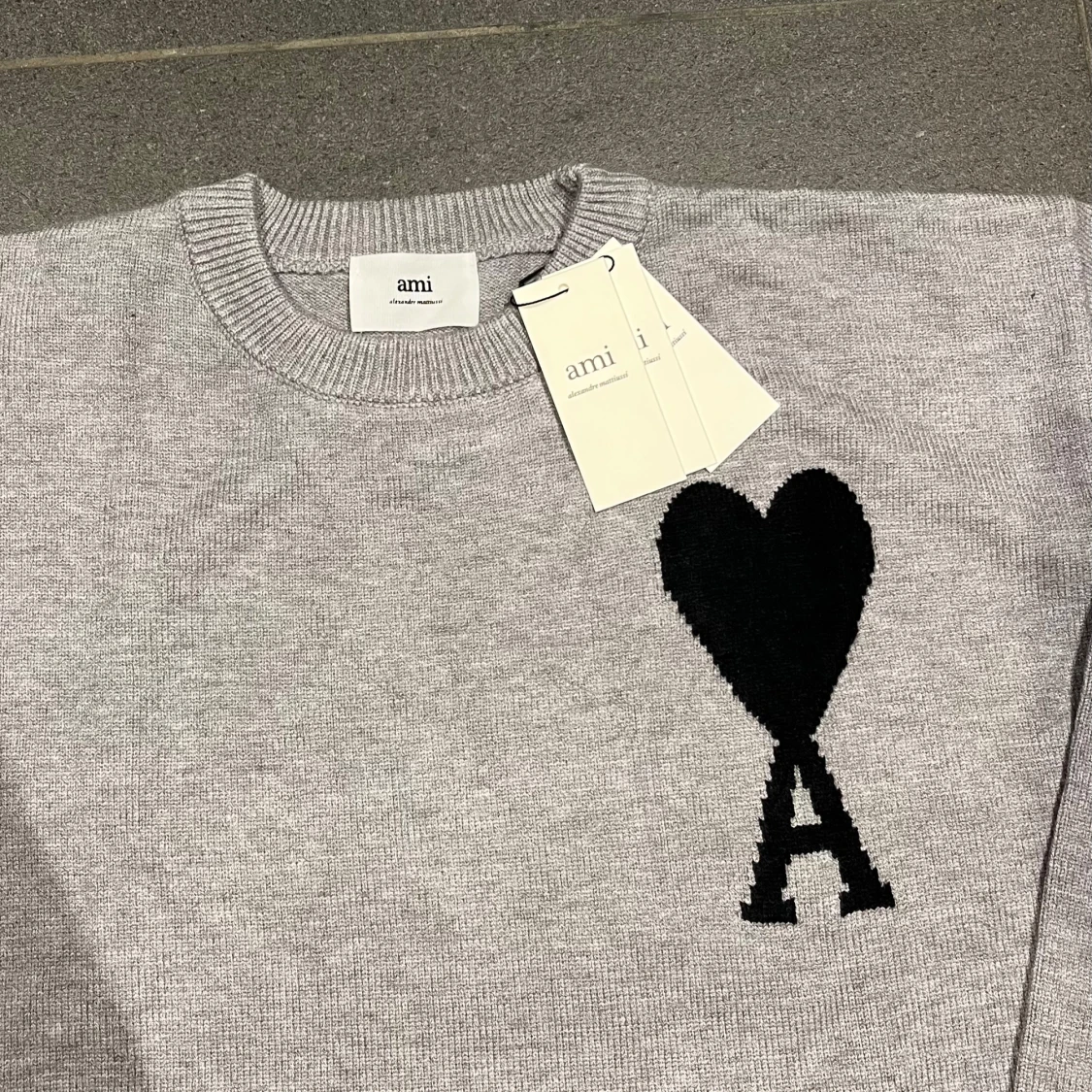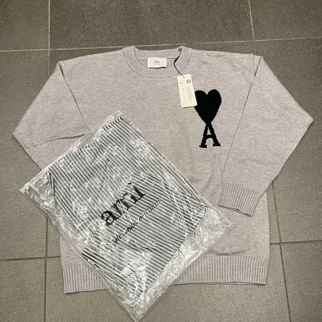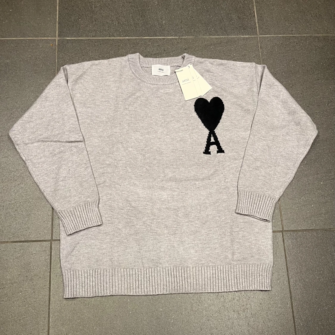 Snygg ljusgrå stickad tröja från Ami Paris med svart hjärta och A-logga på bröstet. Tröjan har rund hals, ribbade muddar och är långärmad. Perfekt för dig som gillar stilrena detaljer och vill ha något som sticker ut lite extra.