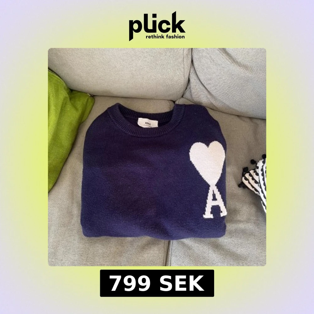 Mörkblå stickad tröja från Ami Paris med rund halsringning och lång ärm. På bröstet finns ett vitt hjärta och bokstaven A. Väldigt cozy tröja som är perfekt för vintern eller annan årstid.