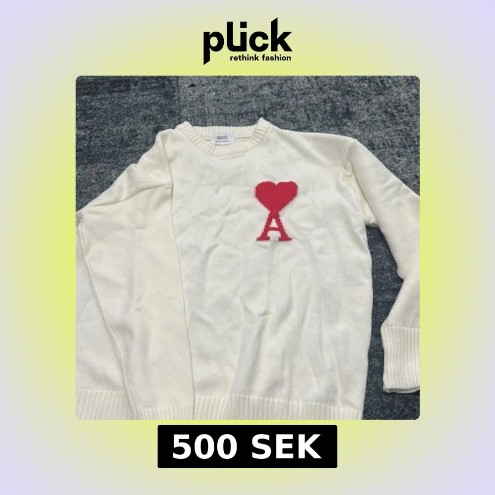 Vit stickad tröja från Ami Paris med röd hjärtlogga och bokstaven A på bröstet. Tröjan har rund halsringning, ribbade muddar och lång ärm. Perfekt för dig som gillar stilrena plagg med en twist.