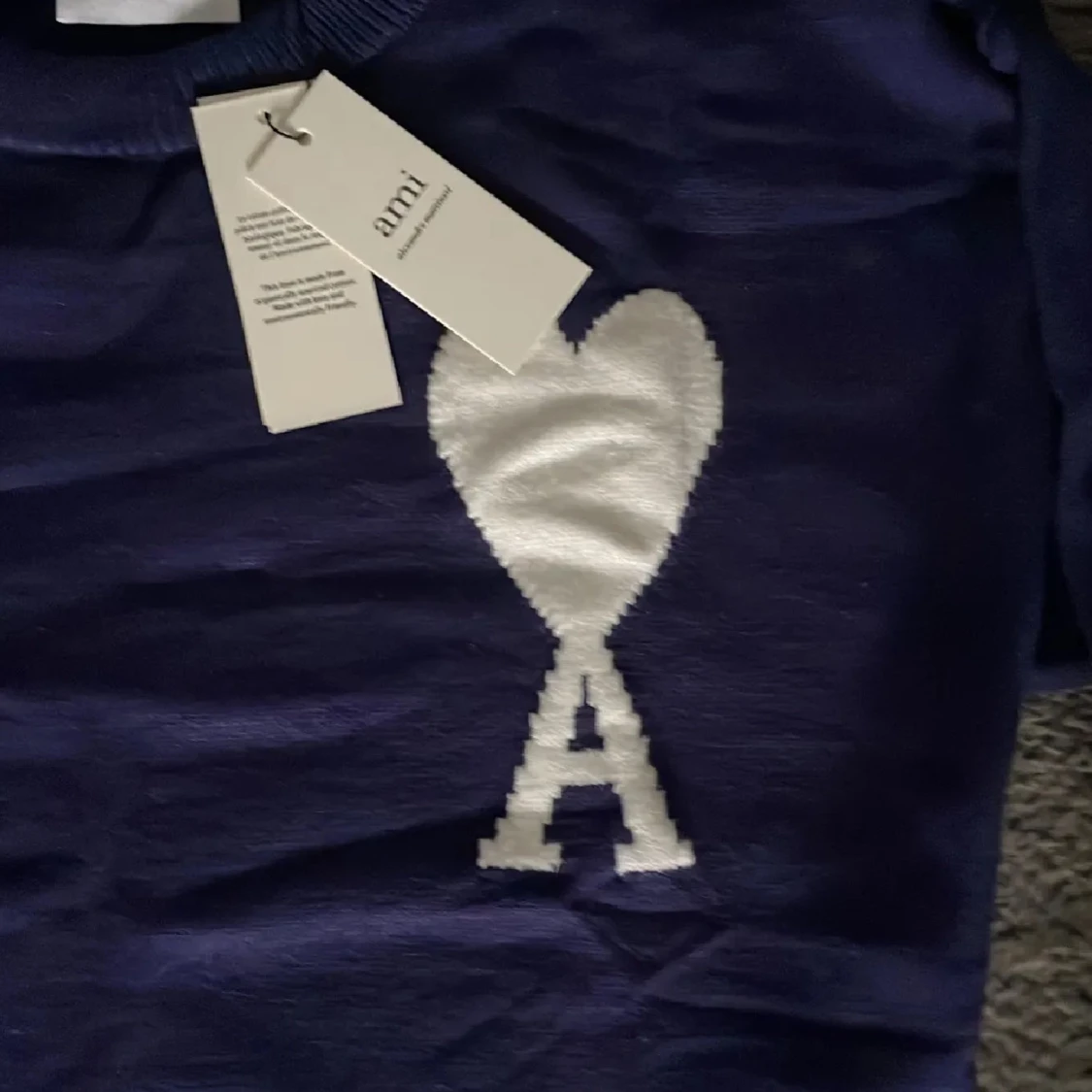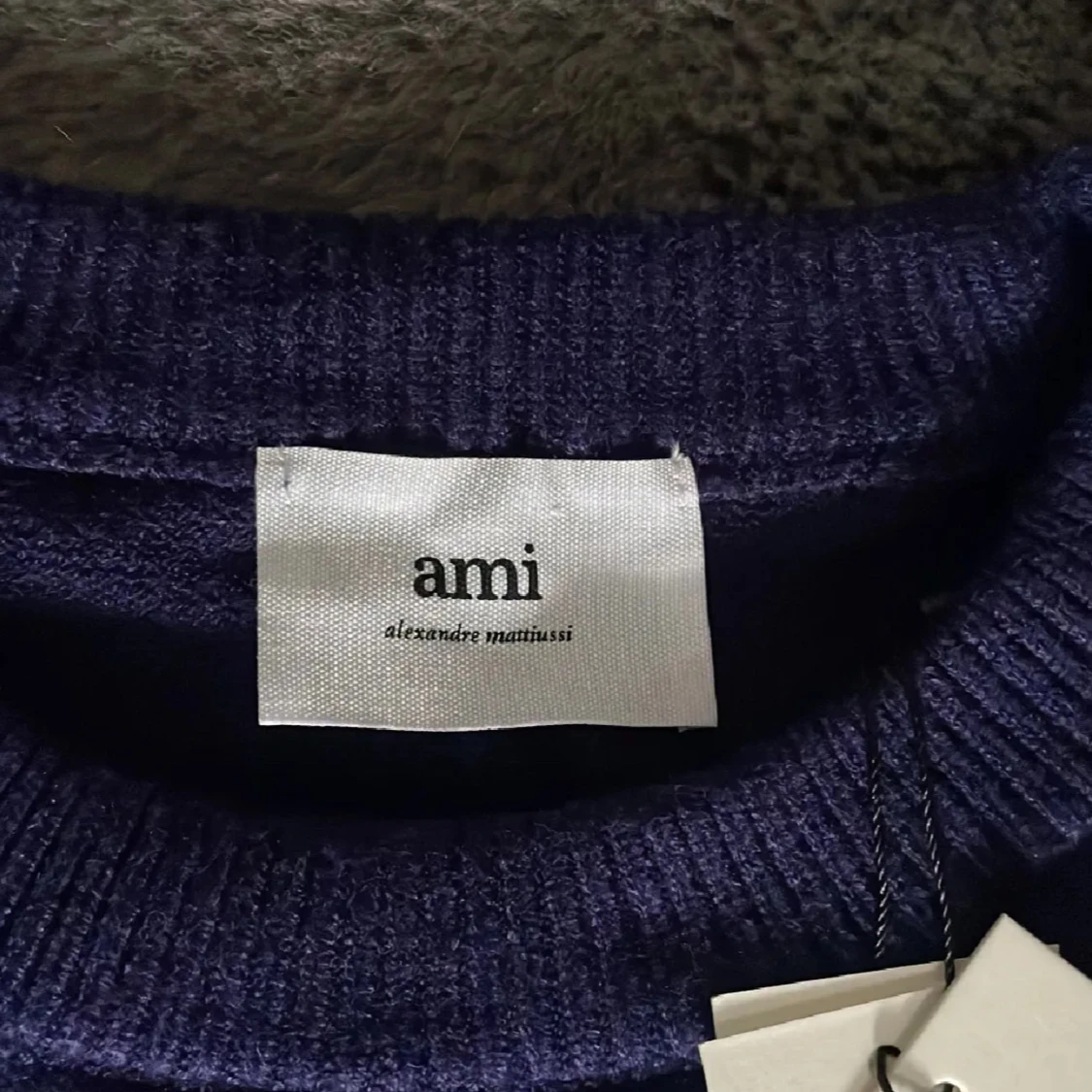 Snygg mörkblå stickad tröja från Ami Alexandre Mattiussi med stort vitt hjärta och bokstaven A på bröstet. Tröjan har rund hals, långa ärmar och ribbade muddar. Perfekt för dig som gillar stilrena och trendiga plagg. Passar någon runt 180. Perfekt för hösten och vintern🍂❄️